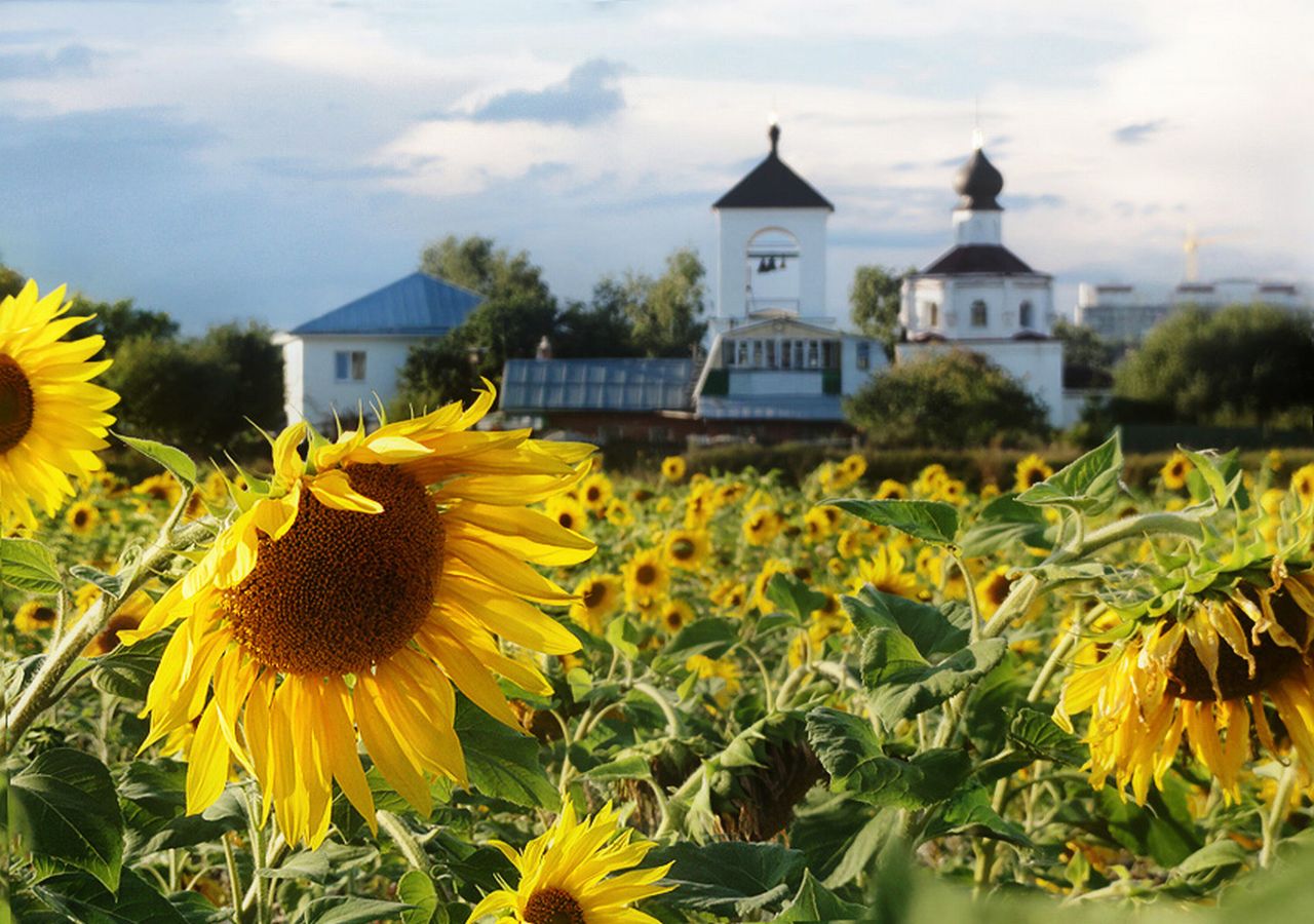 Скачать обои для рабочего стола Подсолнухи у храма и фото
