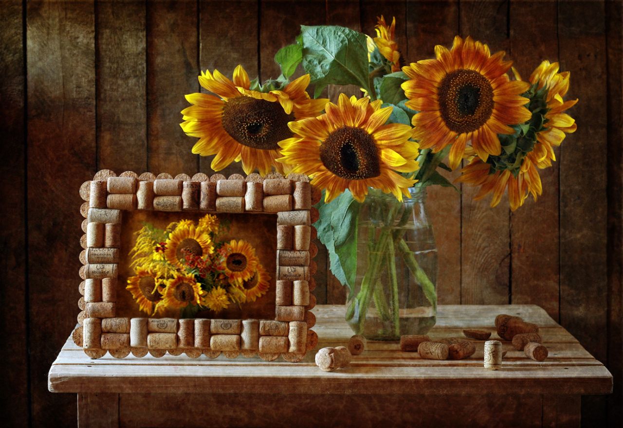 Похожие обои на Подсолнухи в вазе и на картине: