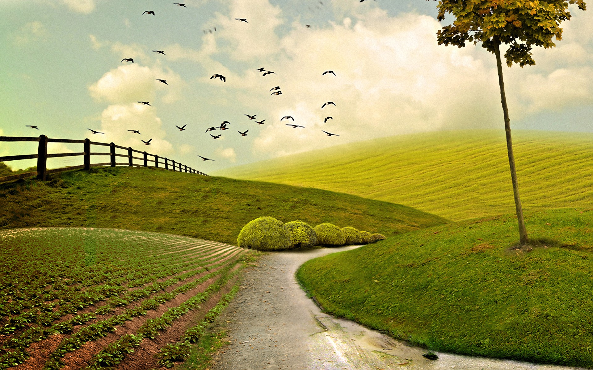 Скачать обои для рабочего стола Поля на холмах и забор и фото