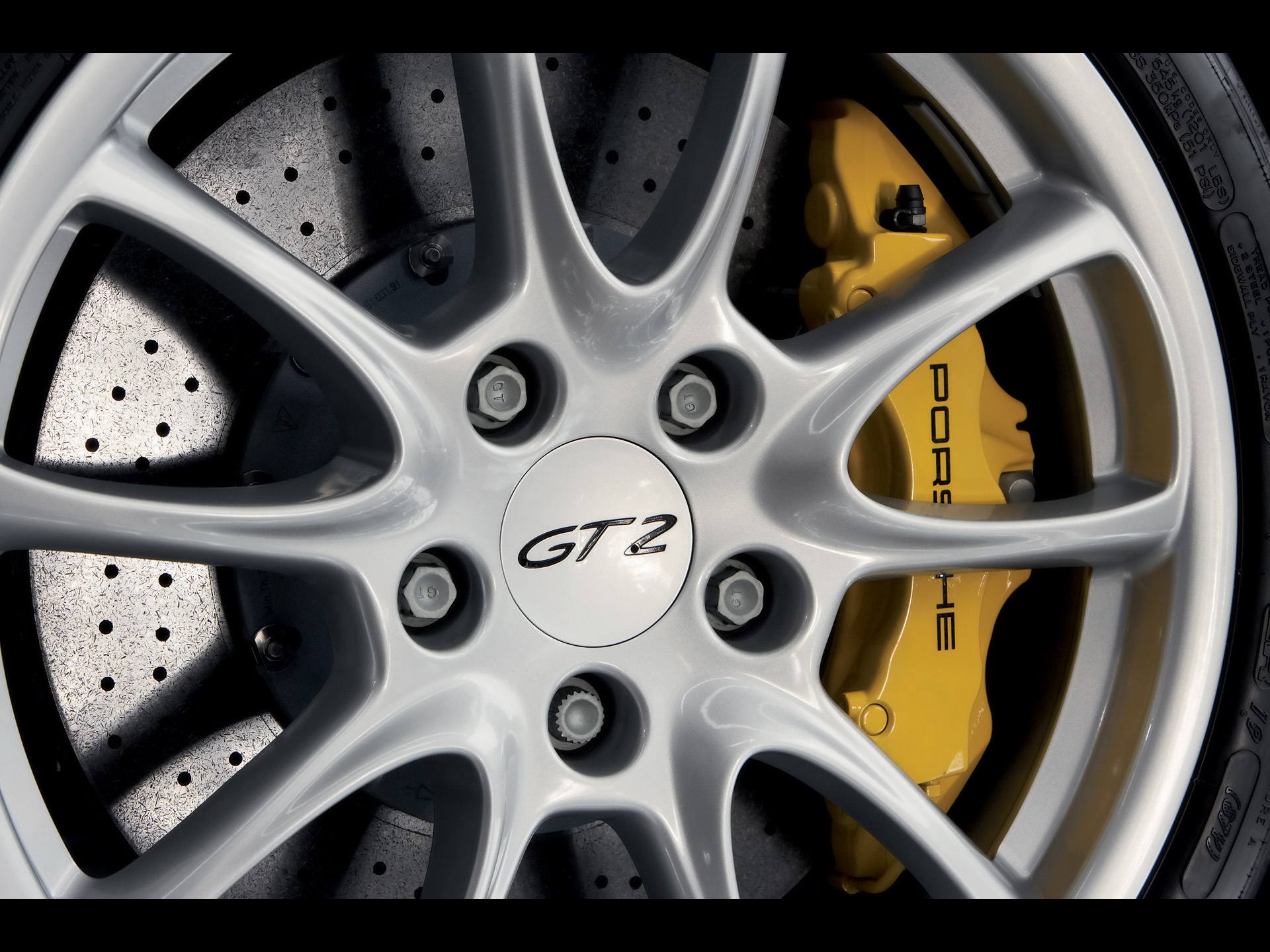 Обои Porsche 911 GT2 As standard 19 inch light metal alloy GT design wheels and PCCB braking system