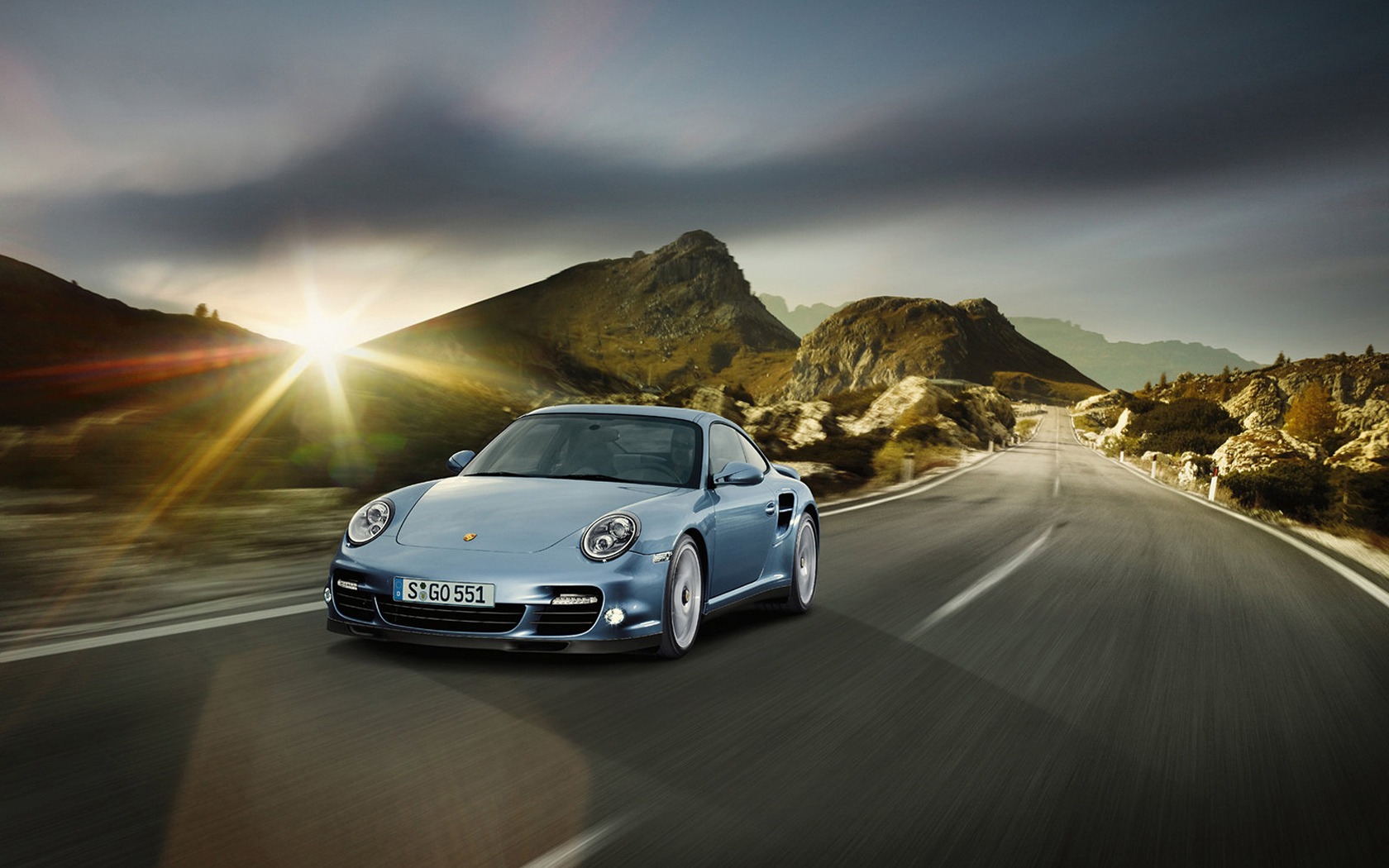Скачать обои для рабочего стола Porsche 911 Turbo S на фоне солнца и фото