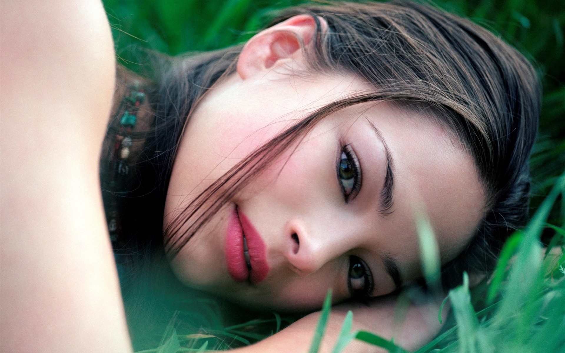 Скачать обои для рабочего стола Портрет девушки в травe лежащей и фото