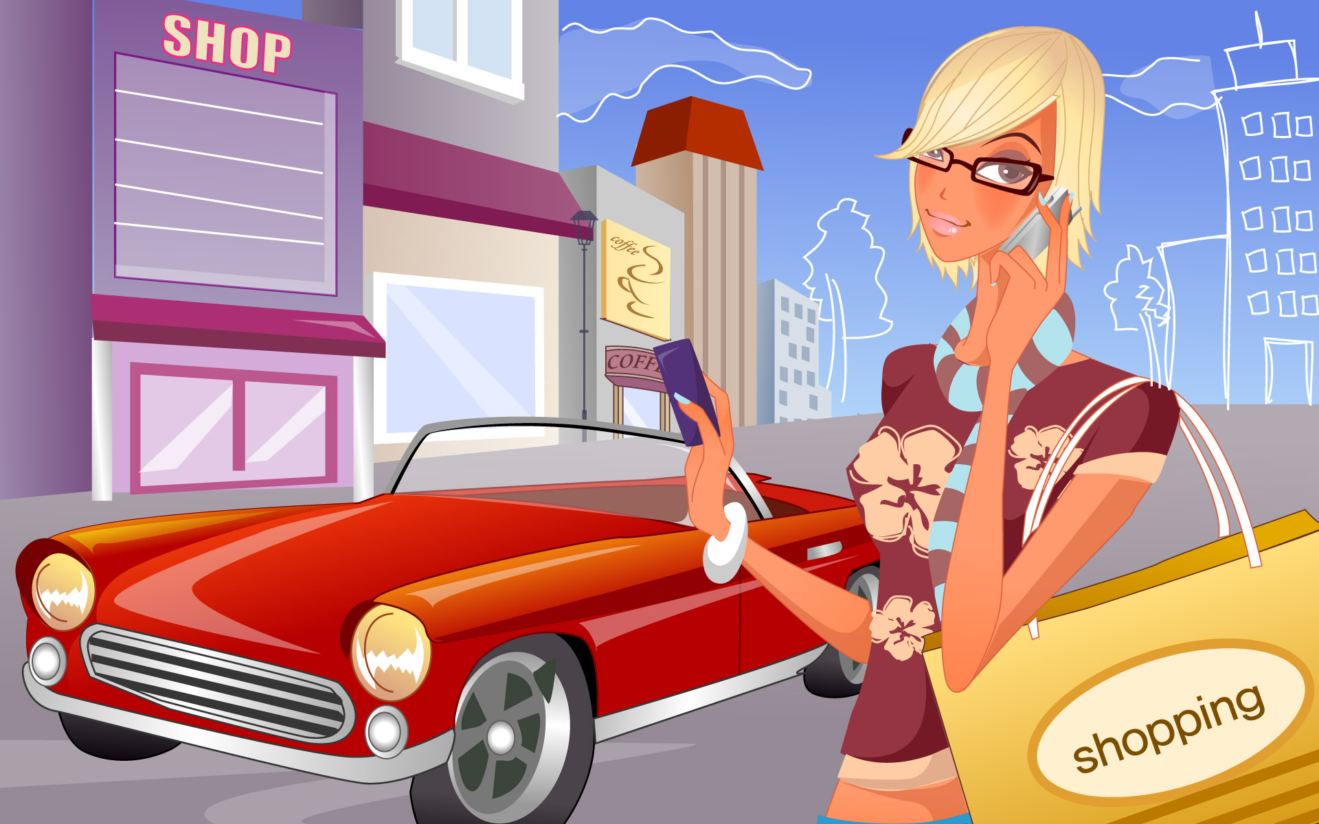 Скачать обои для рабочего стола После шоппинга разговаривает по телефону и фото