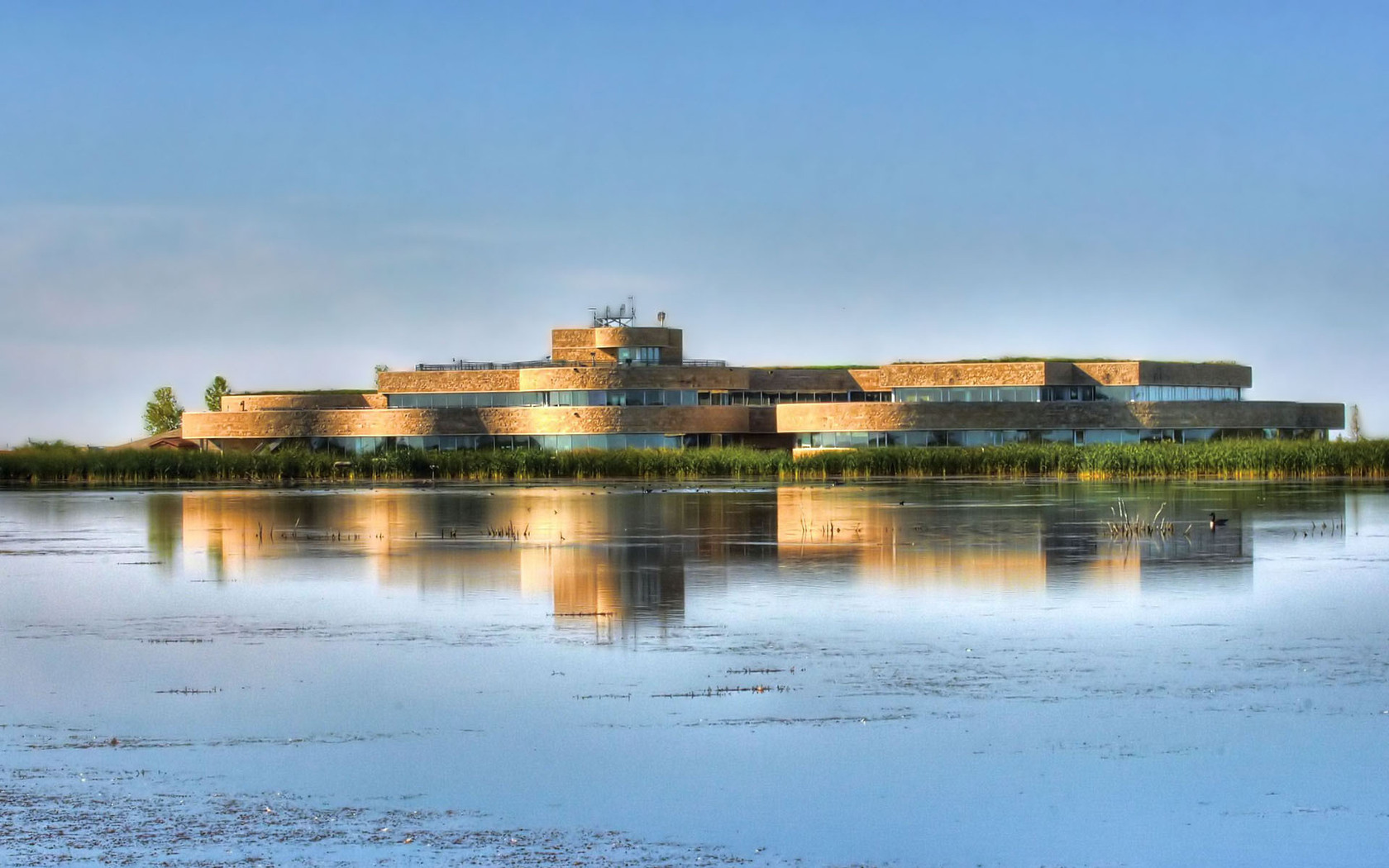 Скачать обои для рабочего стола Производственное здание у водоема и фото
