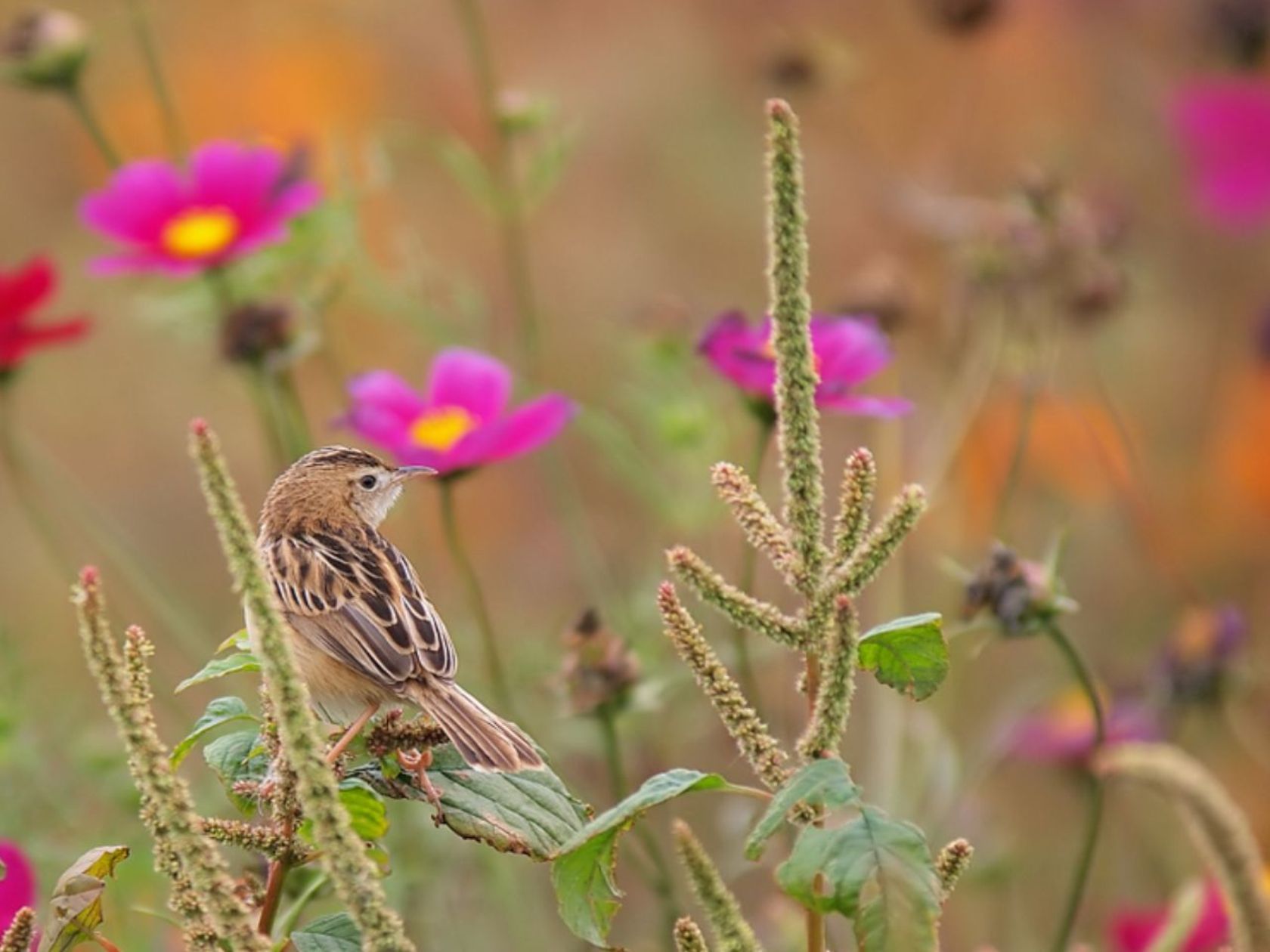 Скачать обои для рабочего стола Птичка и розовые цветы и фото