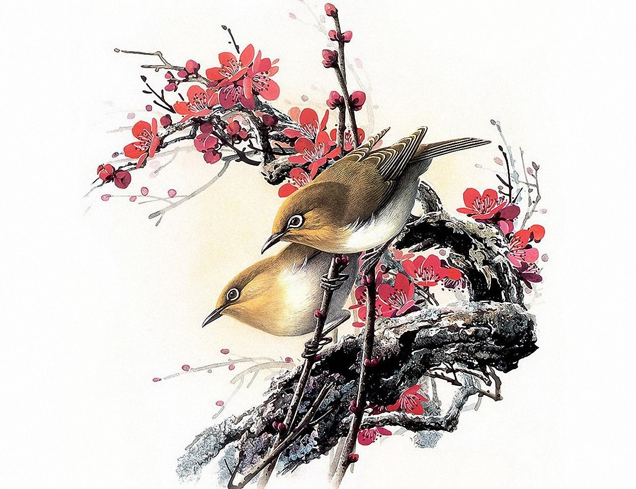 Скачать обои для рабочего стола Птички на цветущей ветке и фото