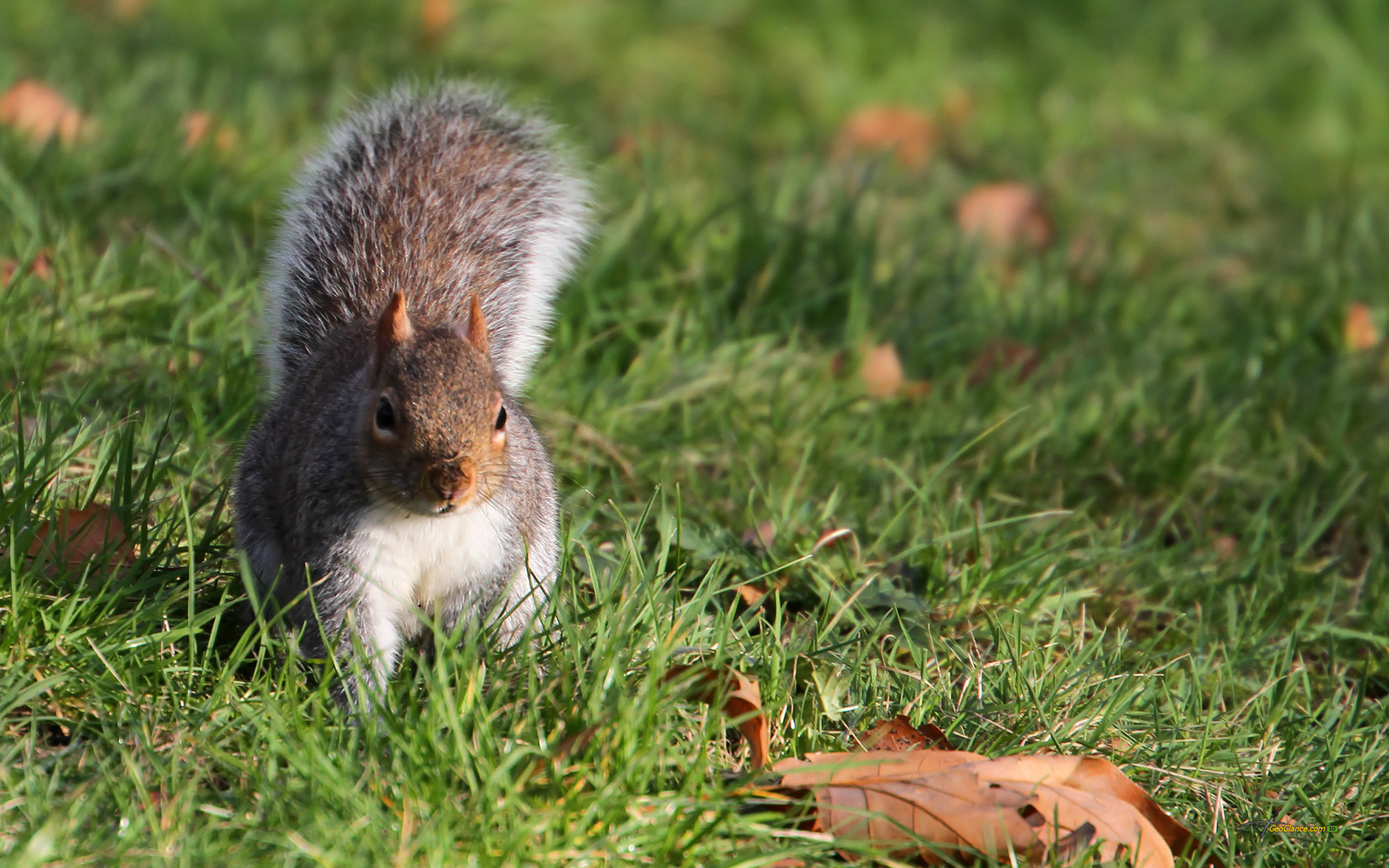 Обои Пушистая белочка в траве и опавшая листва