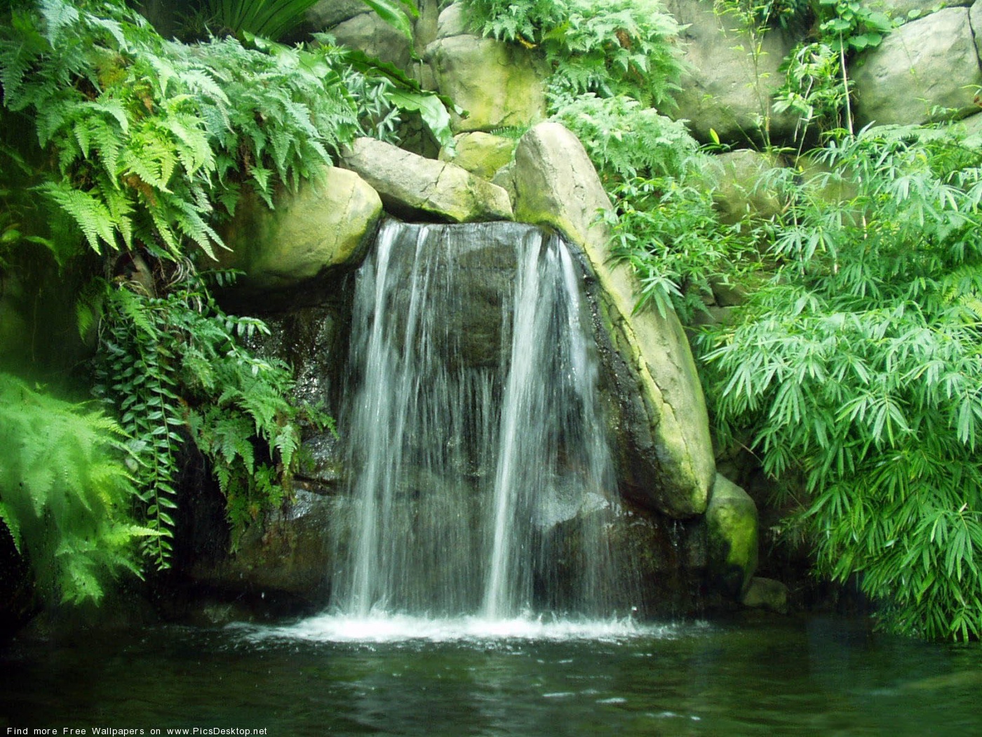 Скачать обои для рабочего стола Пышная флора среди водопада и фото