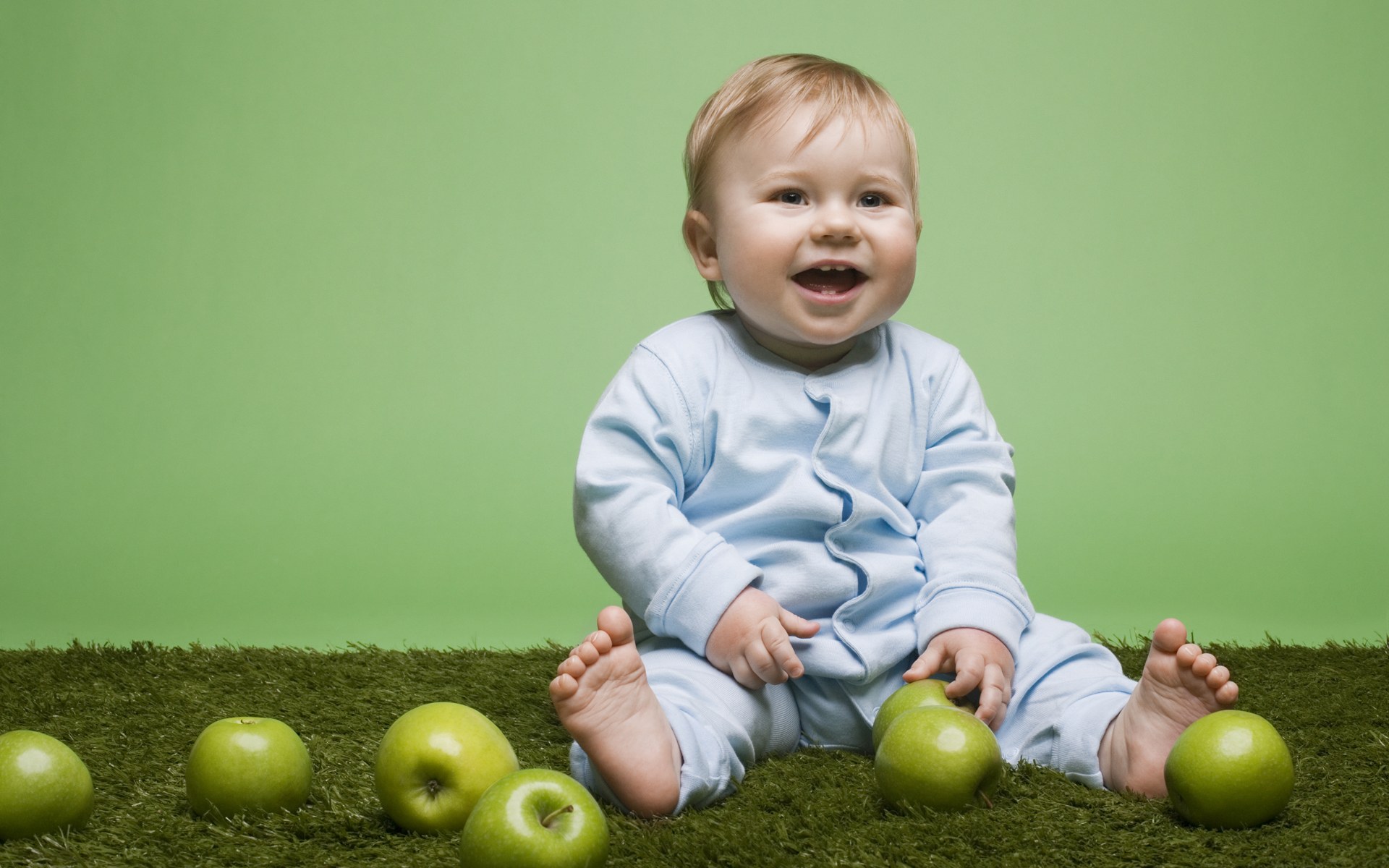 Скачать обои для рабочего стола Радостный ребенок с яблоками вокруг и фото