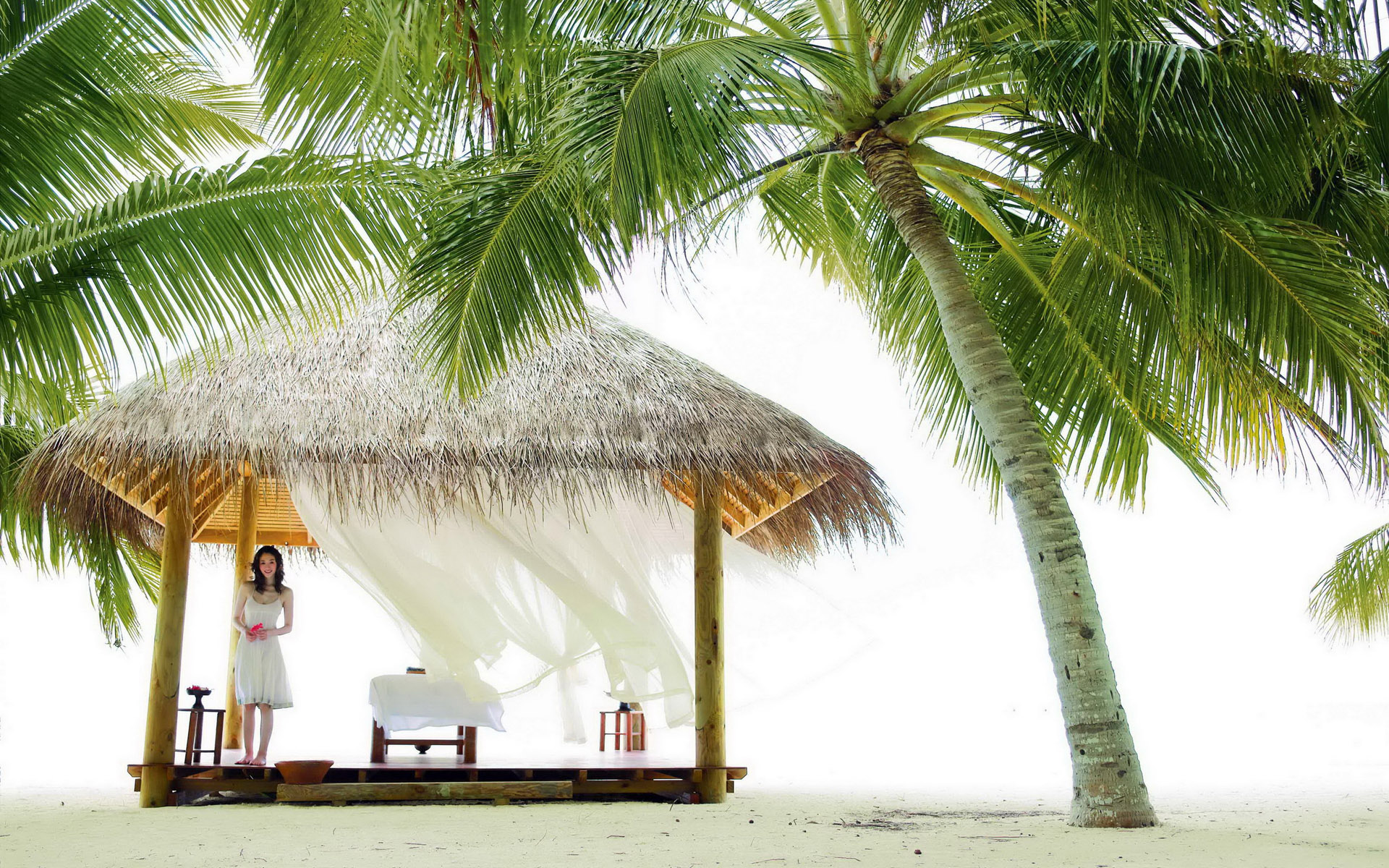 Скачать обои для рабочего стола Райский остров - бунгало, девушка и море и фото
