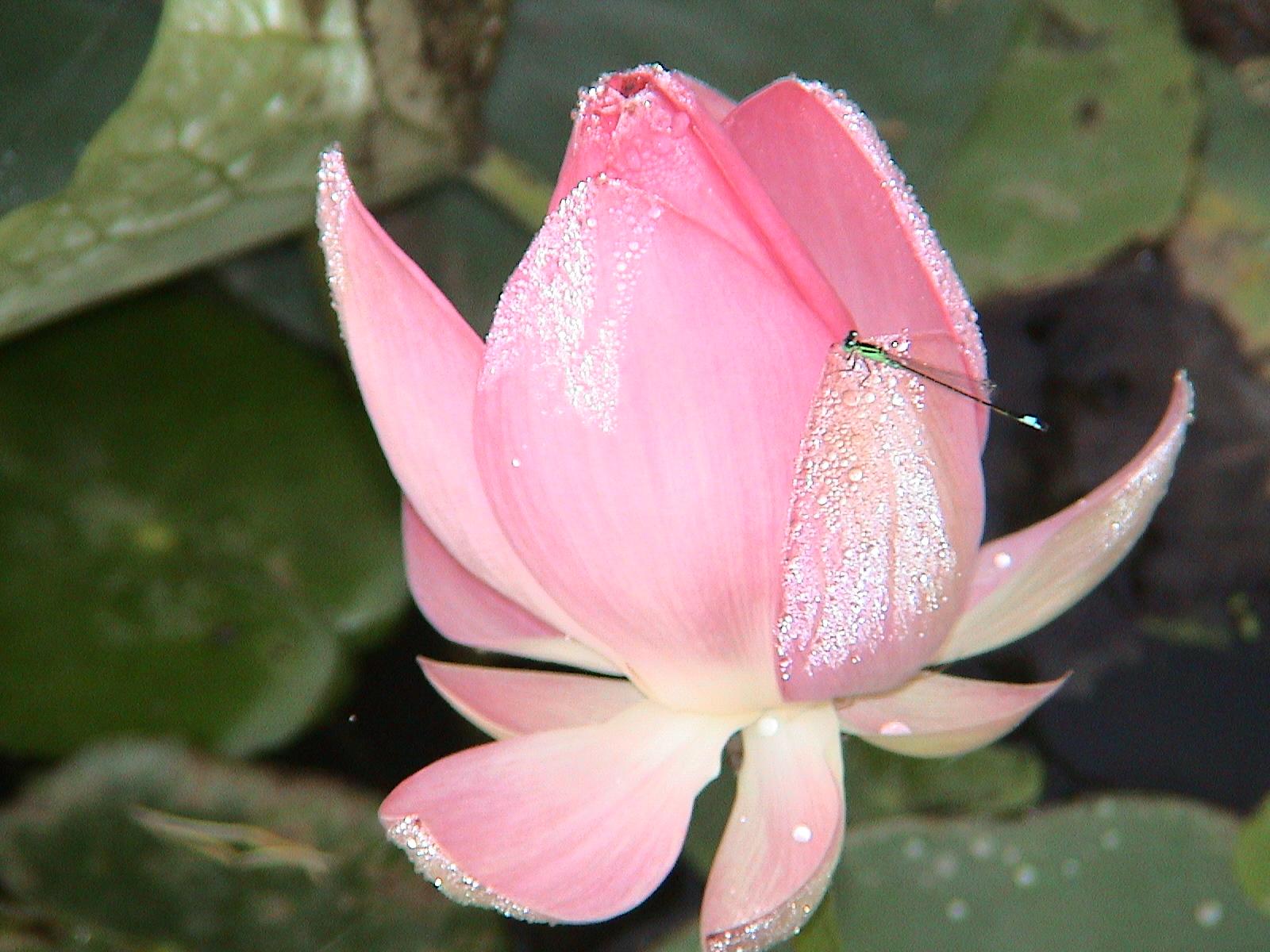 Скачать обои для рабочего стола Распустившийся цветок и стрекоза и фото