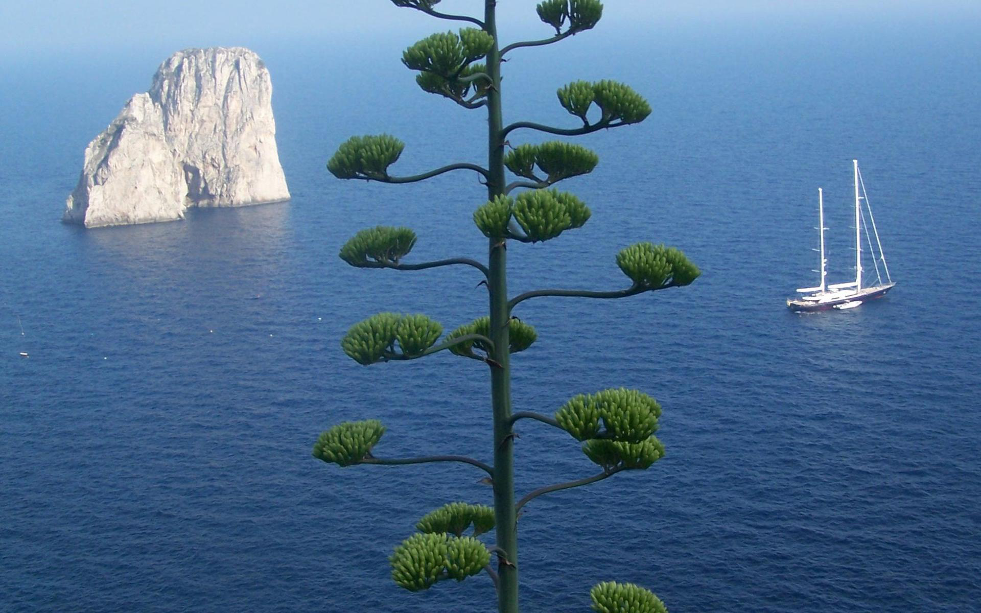 Скачать обои для рабочего стола Растение на фоне моря, яхта и скала и фото