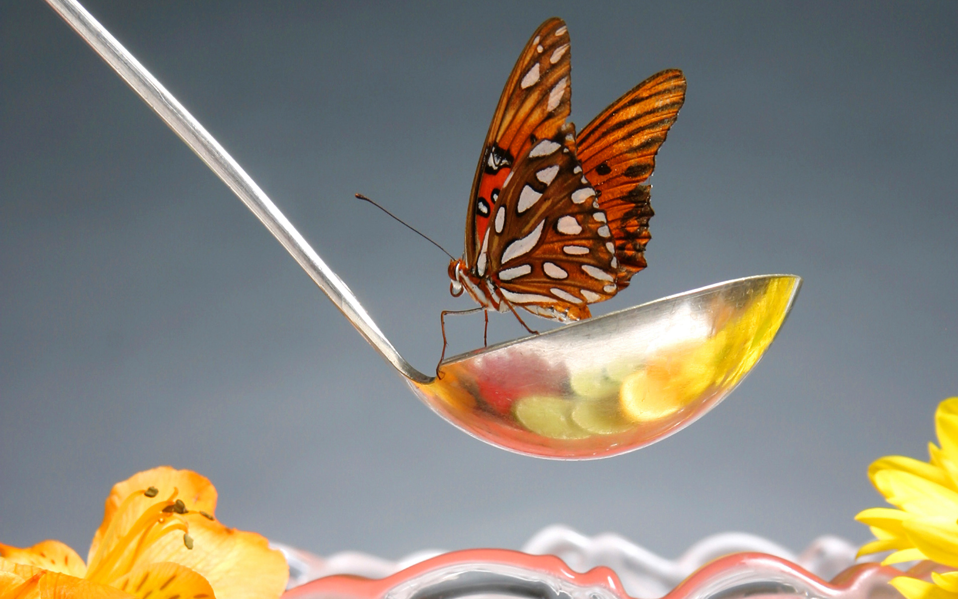 Обои Разноцветная бабочка присела на сладкую чайную ложку