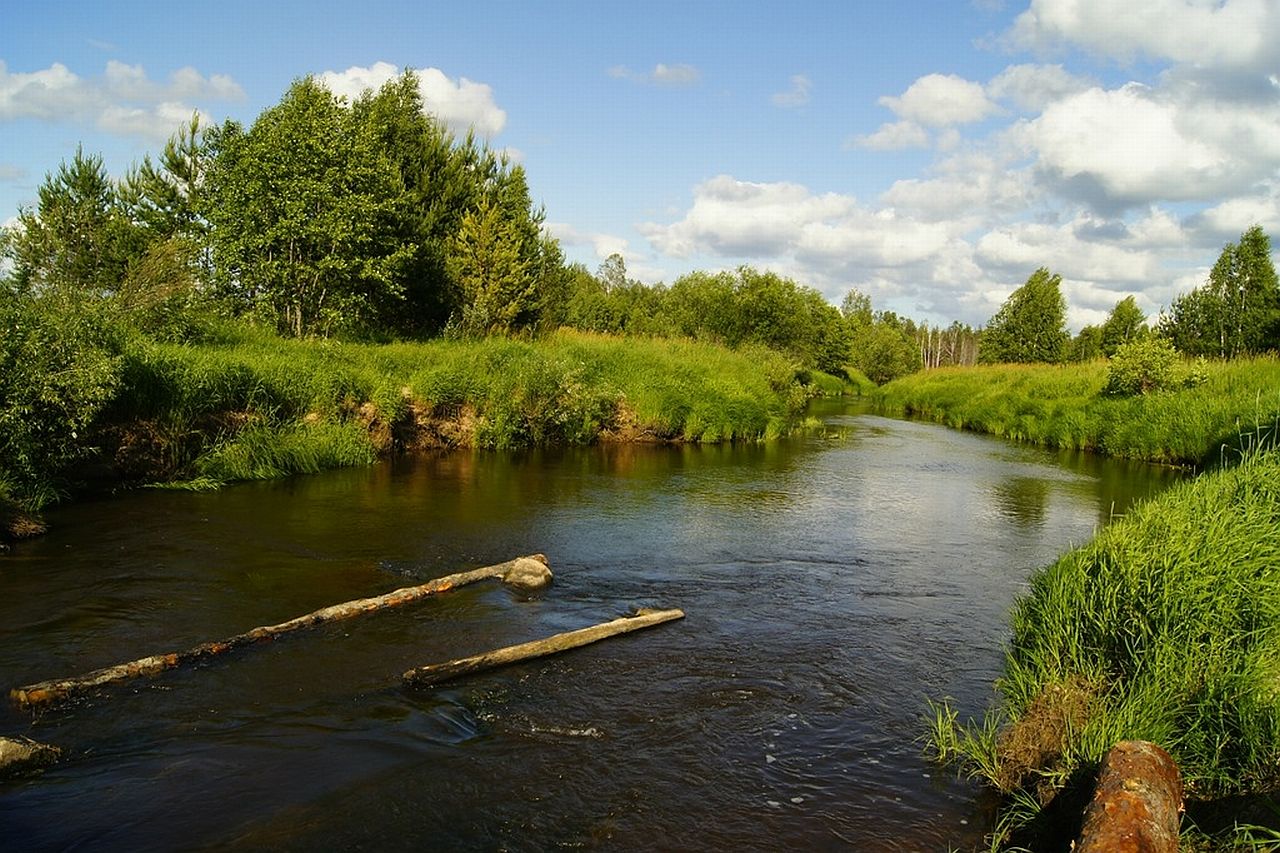 Скачать обои для рабочего стола Речка, деревья и небо и фото