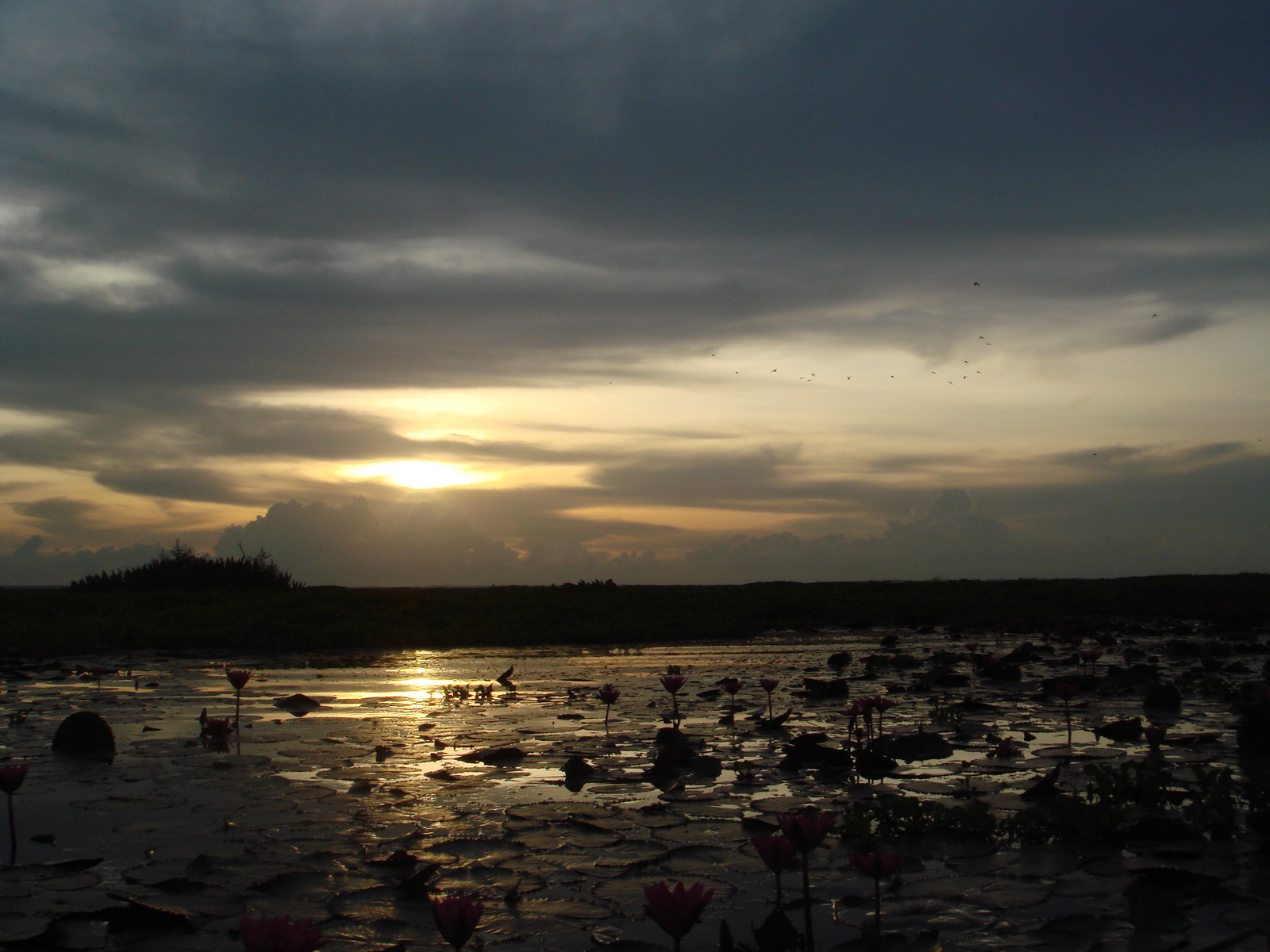 Скачать обои для рабочего стола Река с множеством цветов на закате и фото