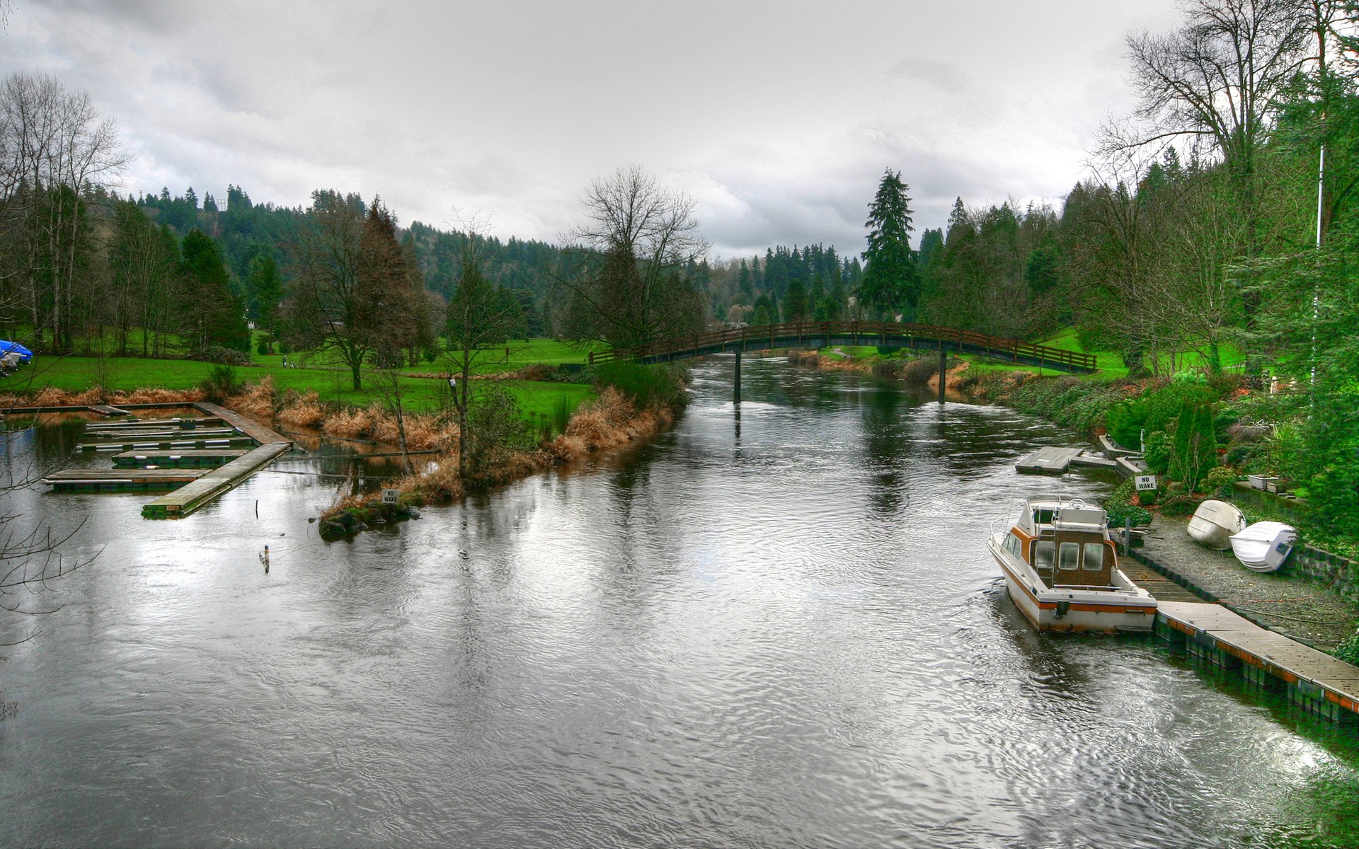 Скачать обои для рабочего стола Река с мостом и лодка на реке и фото