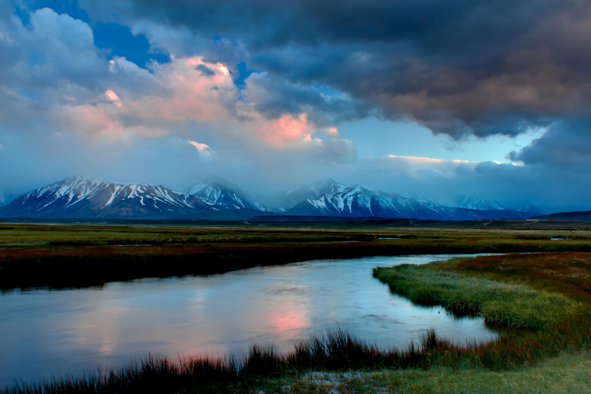 Скачать обои для рабочего стола Река среди равнин на фоне гор и неба и фото