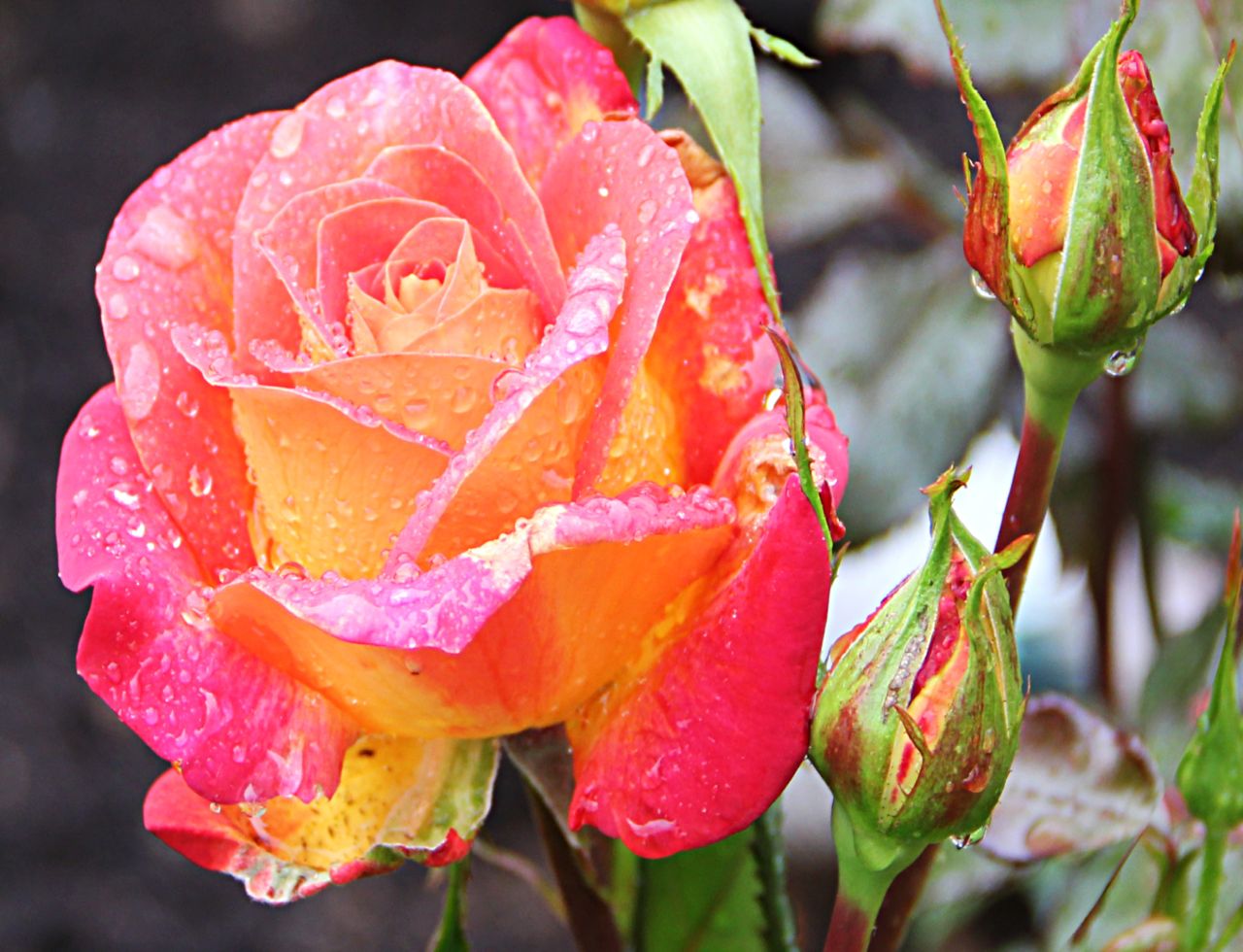 Скачать обои для рабочего стола Роза и бутоны в каплях и фото