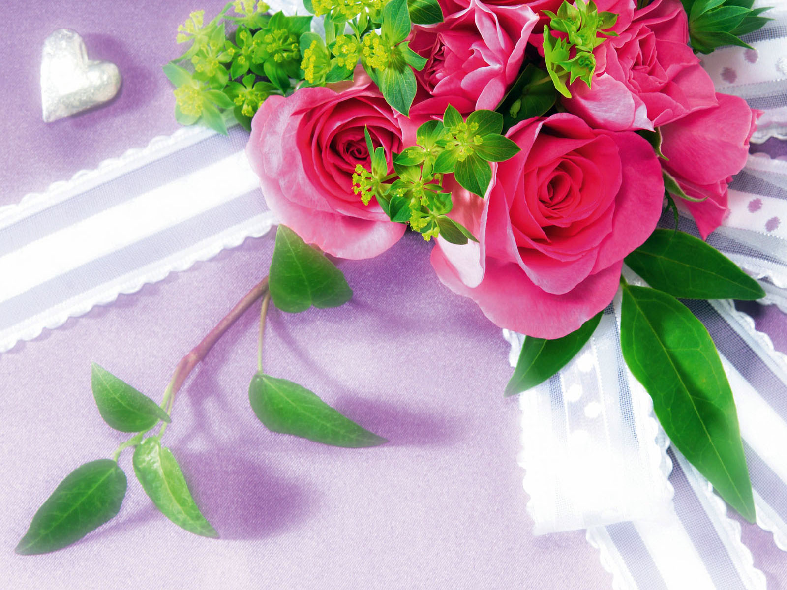 Скачать обои для рабочего стола Розовые розы на фиолетовой скатерти и фото