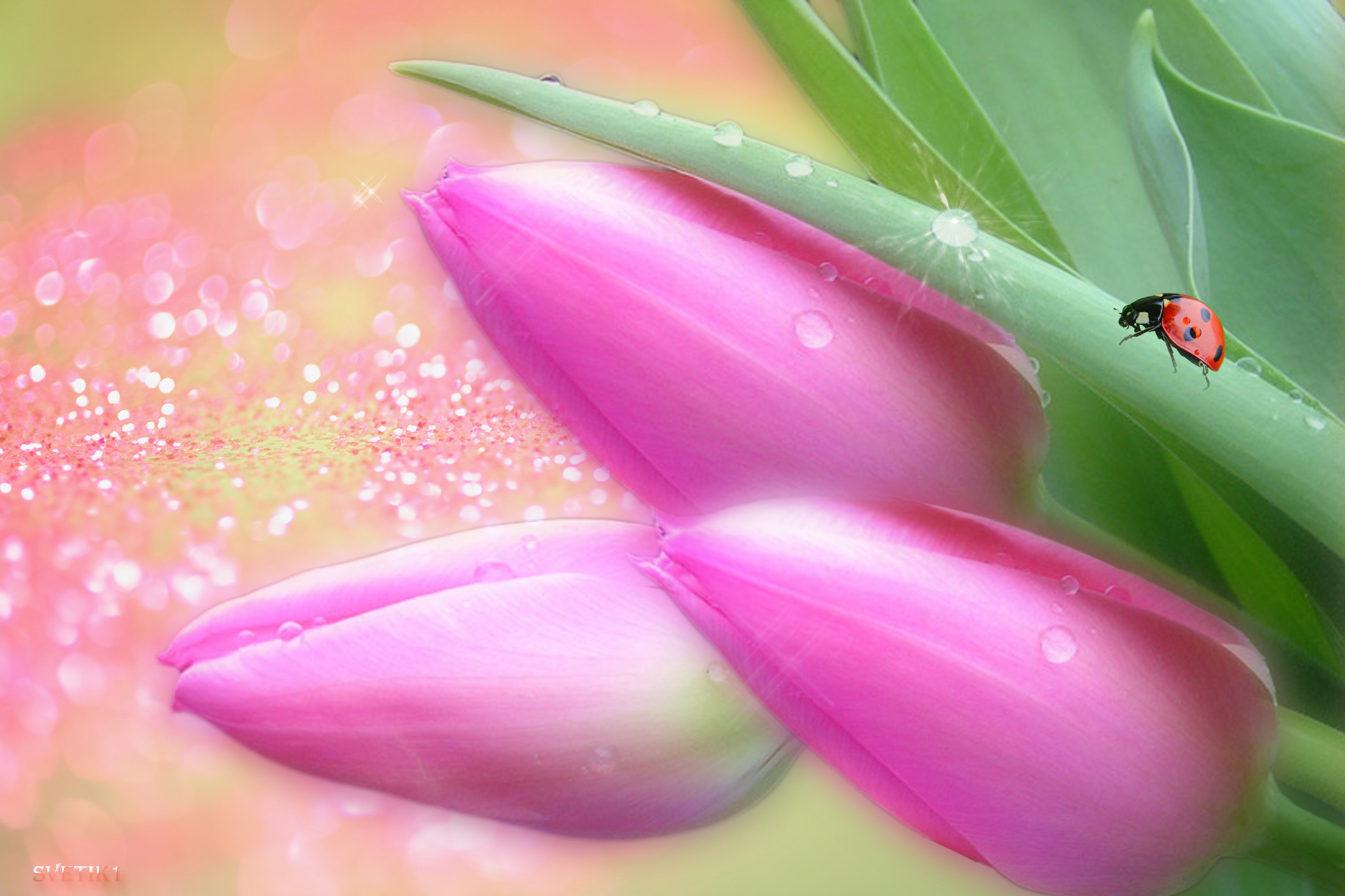 Похожие обои на Розовые тюльпаны и божья коровка: