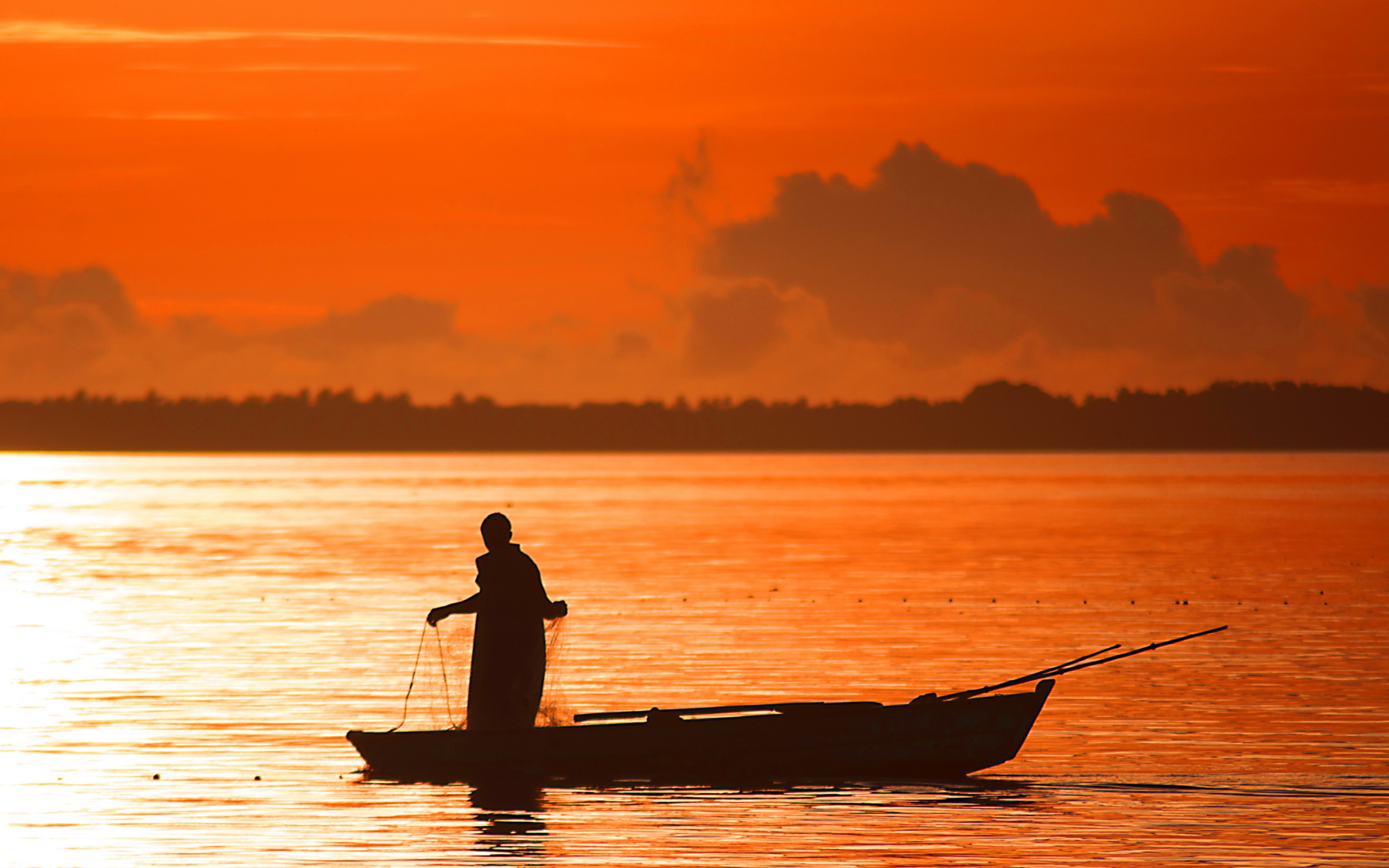 Скачать обои для рабочего стола Рыбак на лодке с сетями и фото