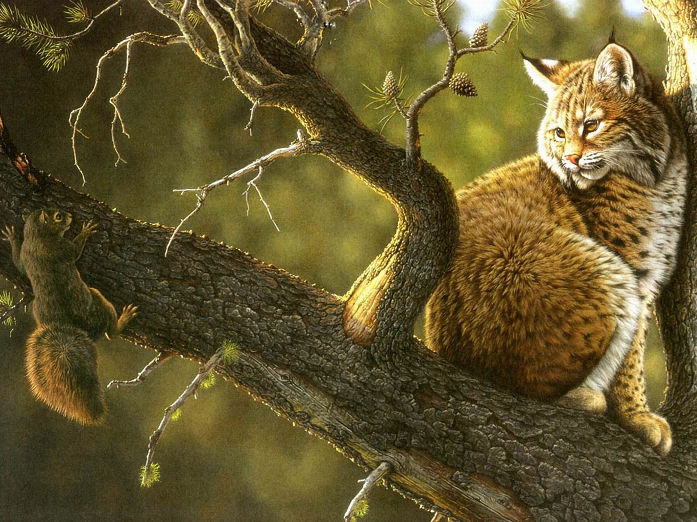 Скачать обои для рабочего стола Рысь и белка на одной ветке и фото