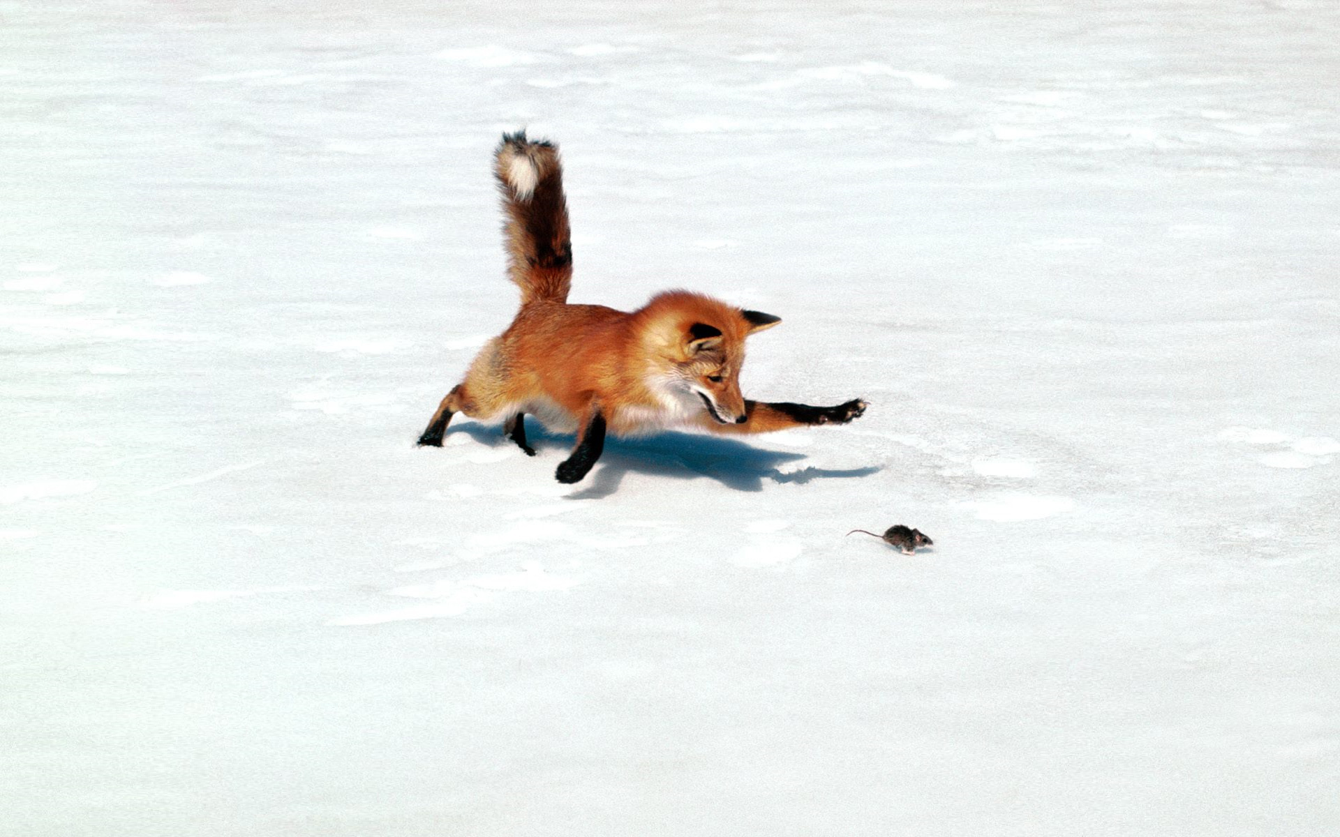 Скачать обои для рабочего стола Рыжая лиса охотится и фото