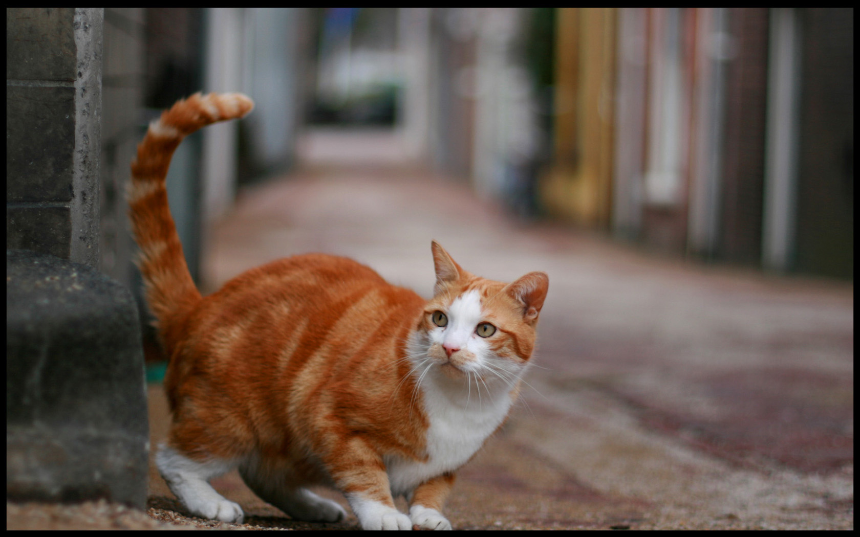 Скачать обои для рабочего стола Рыже-белый кот на улице и фото