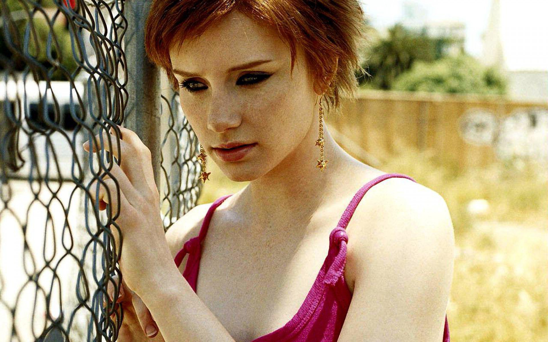 Скачать обои для рабочего стола Рыжеволосая девушка у забора и фото