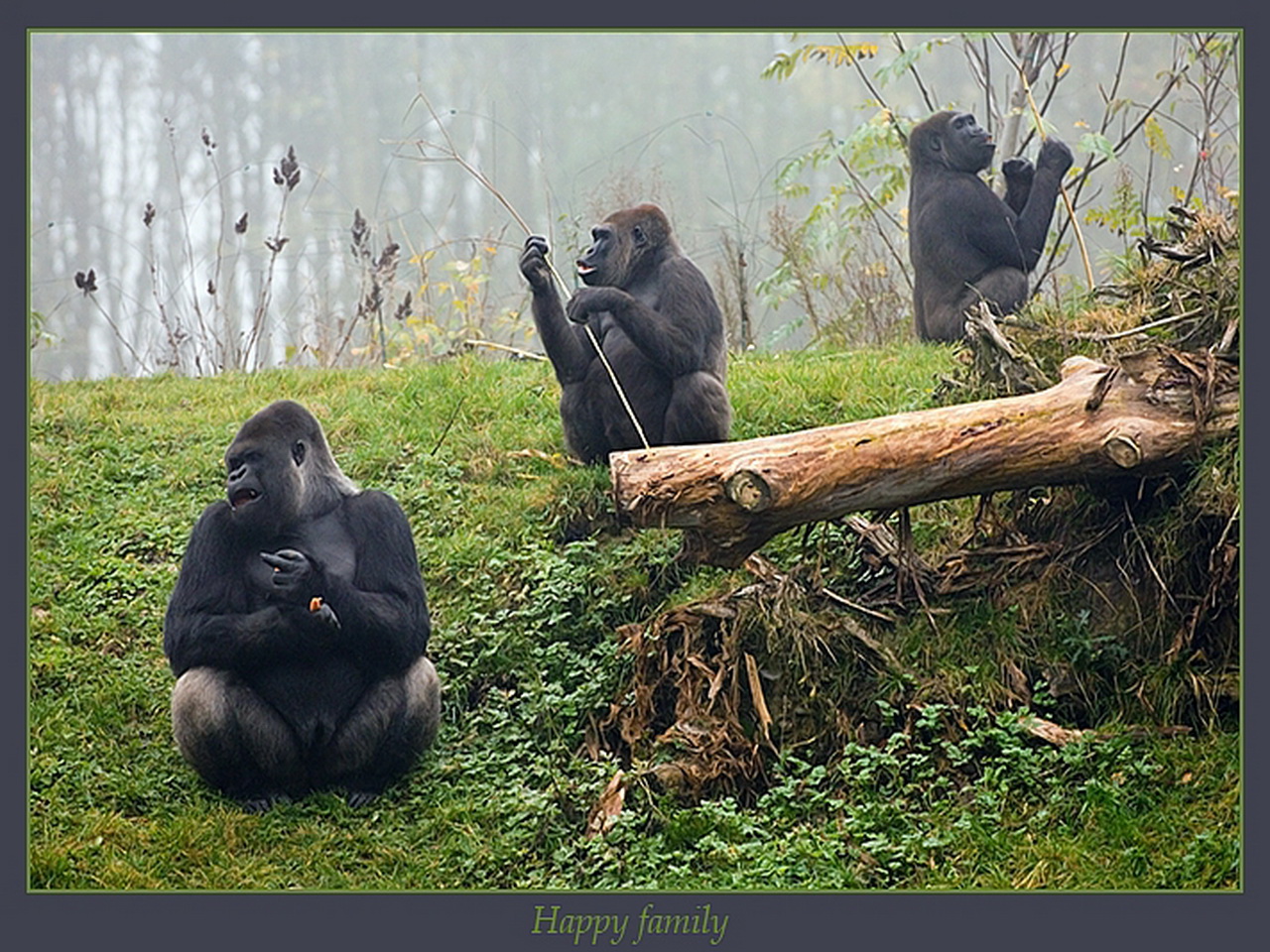Скачать обои для рабочего стола Счастливая семья горил на опушке леса и фото