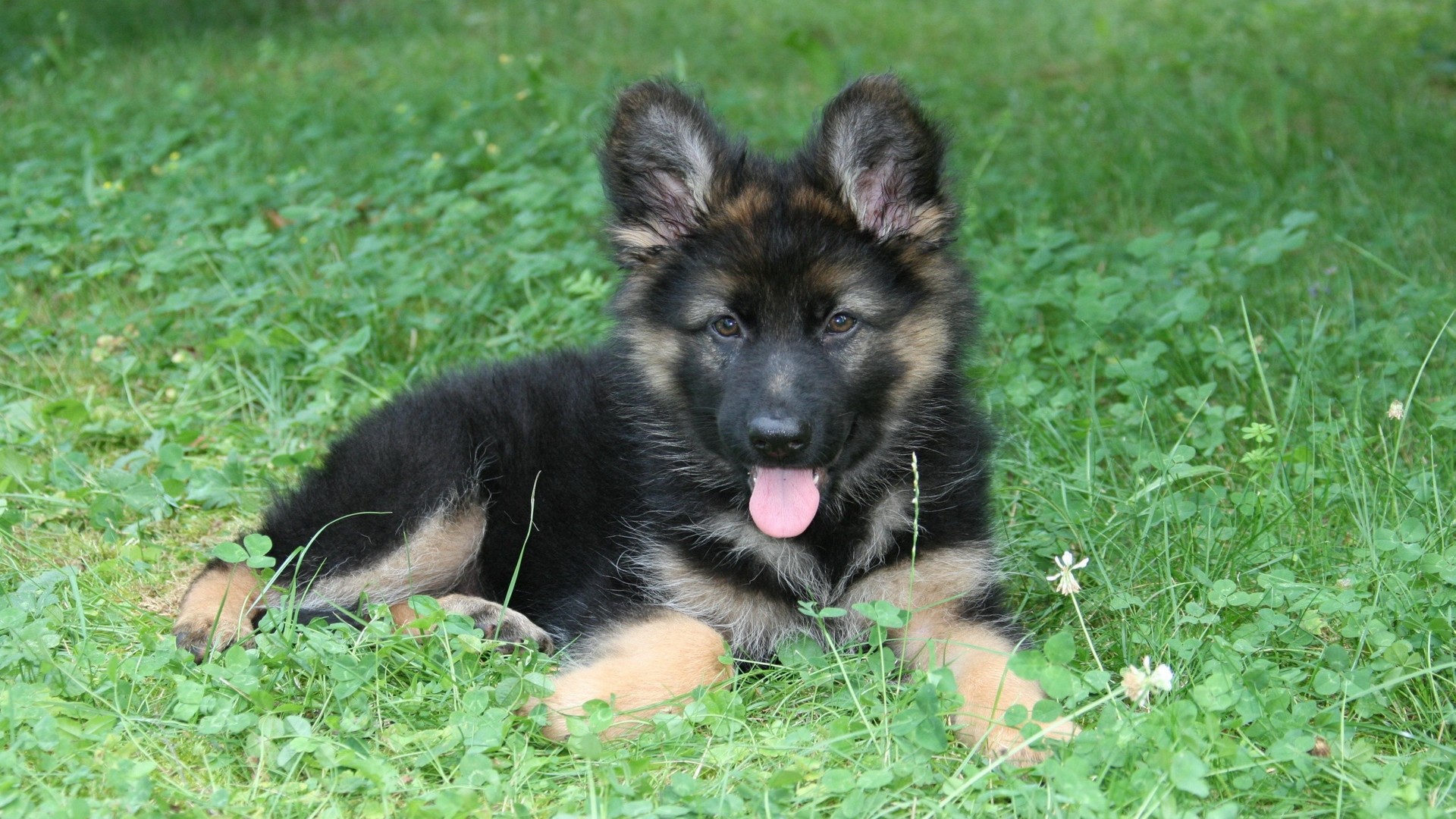 Скачать обои для рабочего стола Щенок черный в траве и фото
