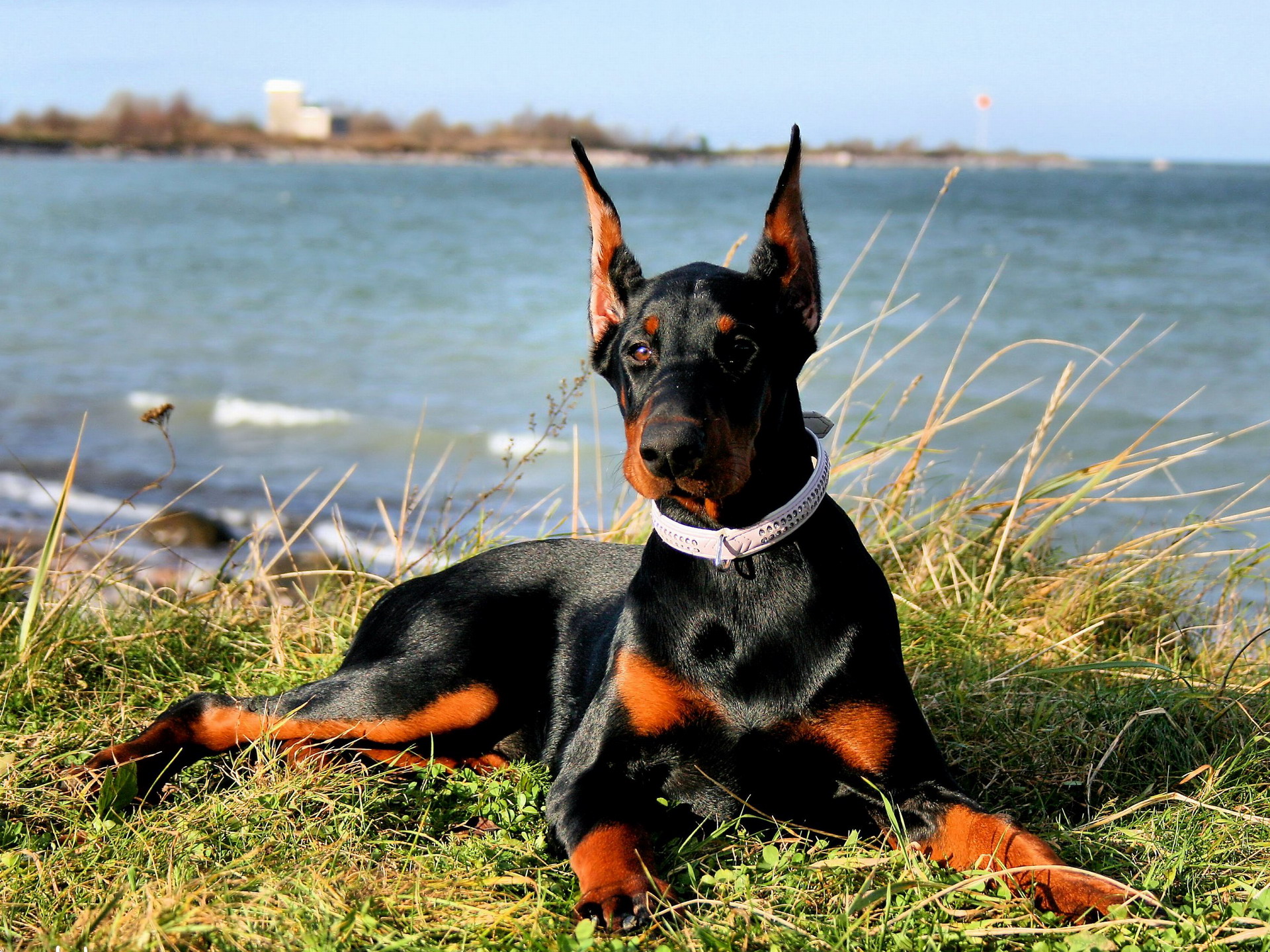 Скачать обои для рабочего стола Щенок добермана на берегу и фото