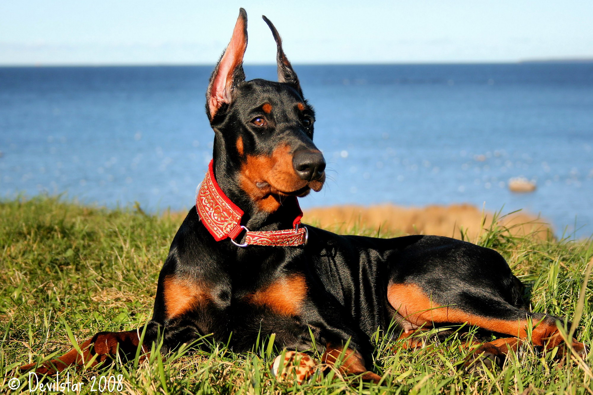 Скачать обои для рабочего стола Щенок добермана на море и фото