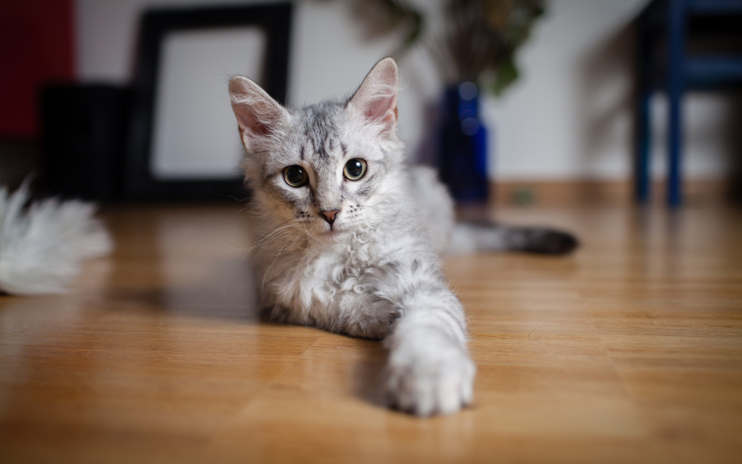 Скачать обои для рабочего стола Серая кошка на ламинатном полу и фото