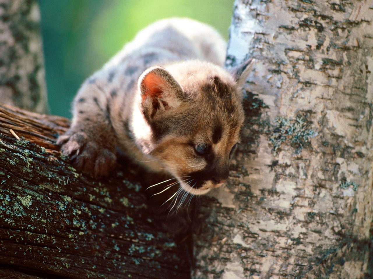 Скачать обои для рабочего стола Серый кот на дереве и фото