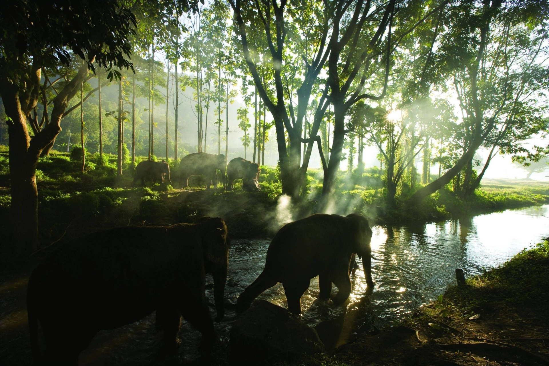 Скачать обои для рабочего стола Шагают слоны по суше и водe и фото