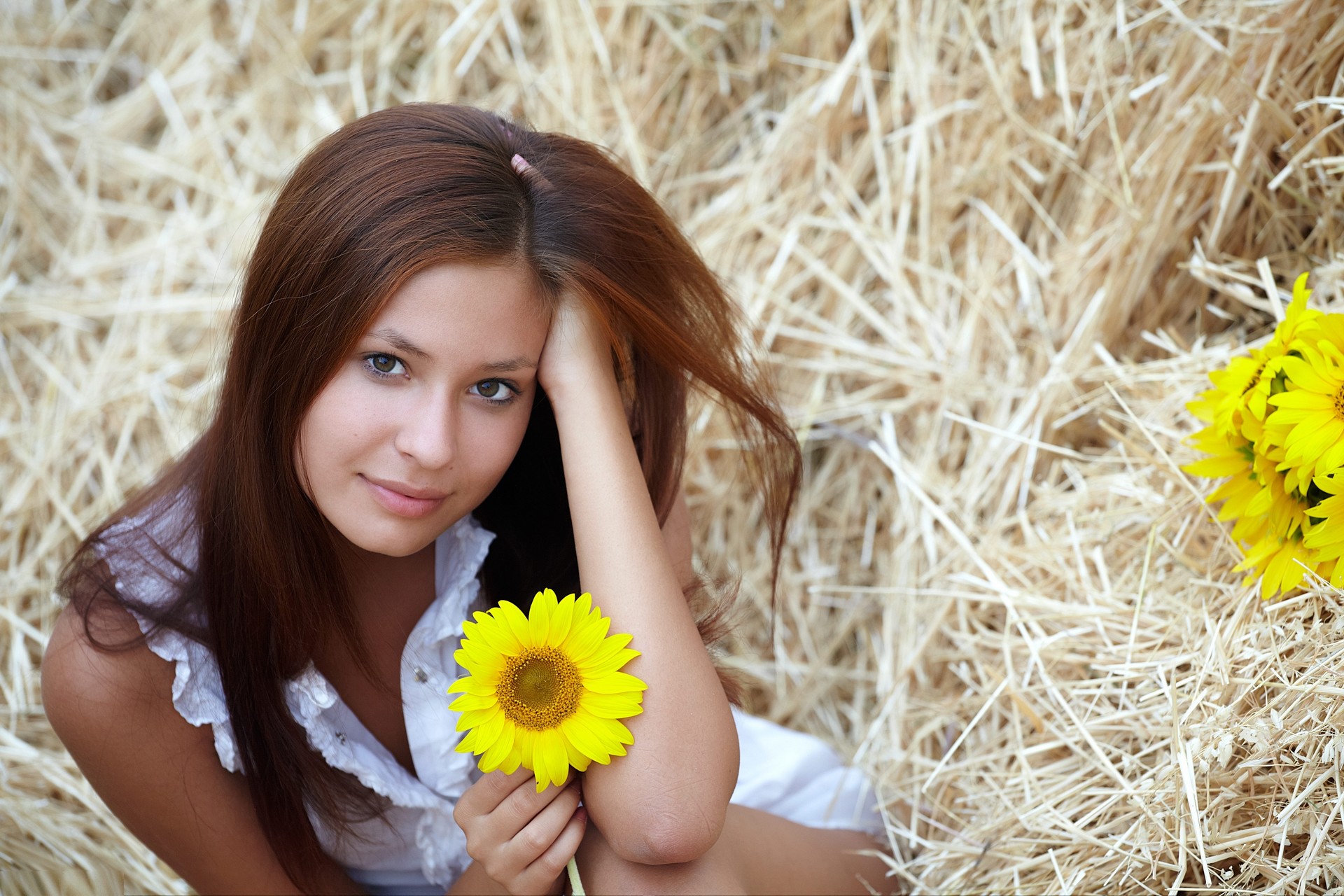 Скачать обои для рабочего стола Шатенка в соломе с цветком и фото