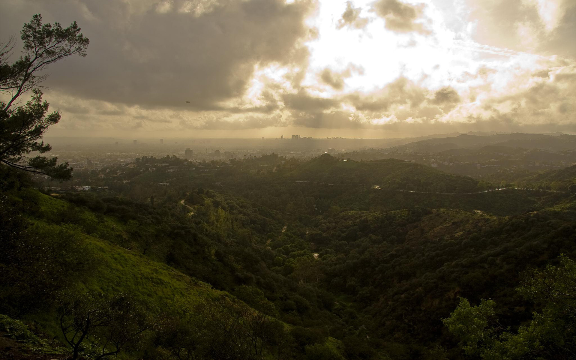 Скачать обои для рабочего стола Широкий вид на горы и город вдали и фото