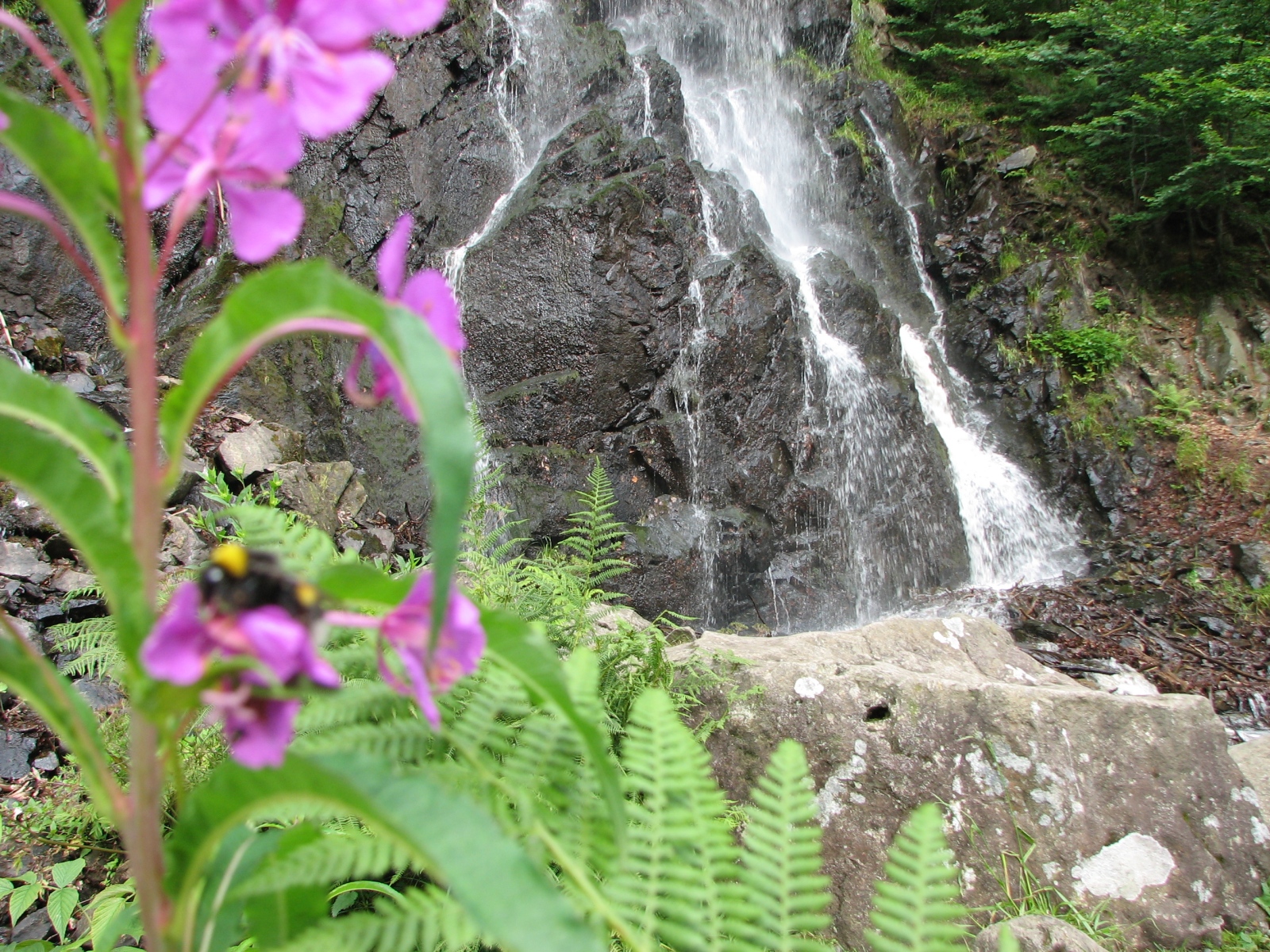 Скачать обои для рабочего стола Шмель на цветке у водопада и фото