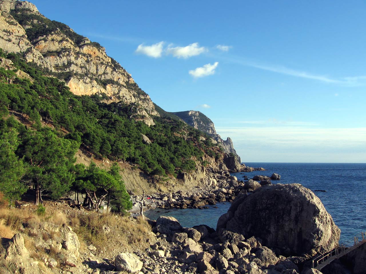 Скачать обои для рабочего стола Скалистый берег со скудной растительностью и фото