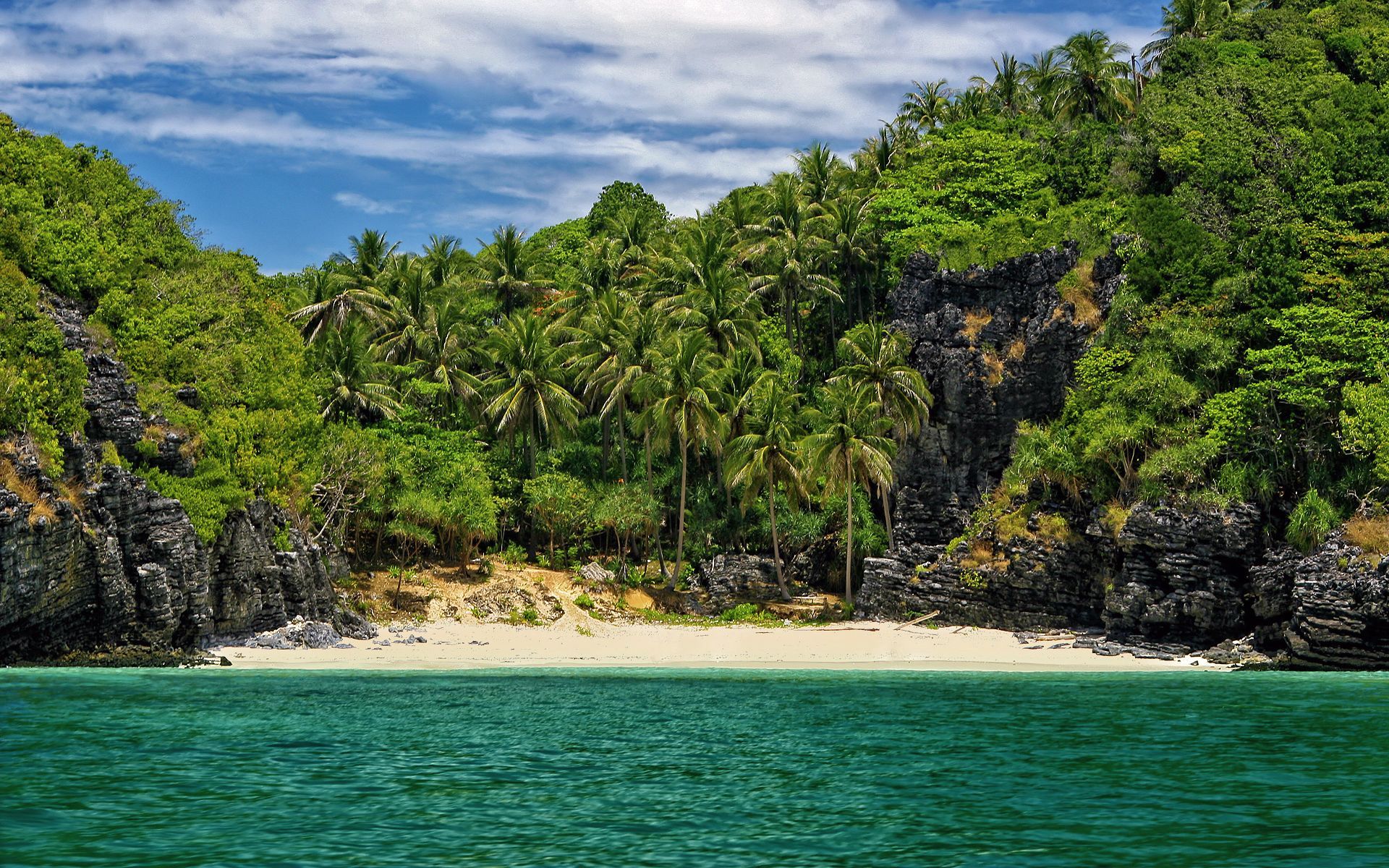 Скачать обои для рабочего стола Скалы и пальмы у побережья океана и фото