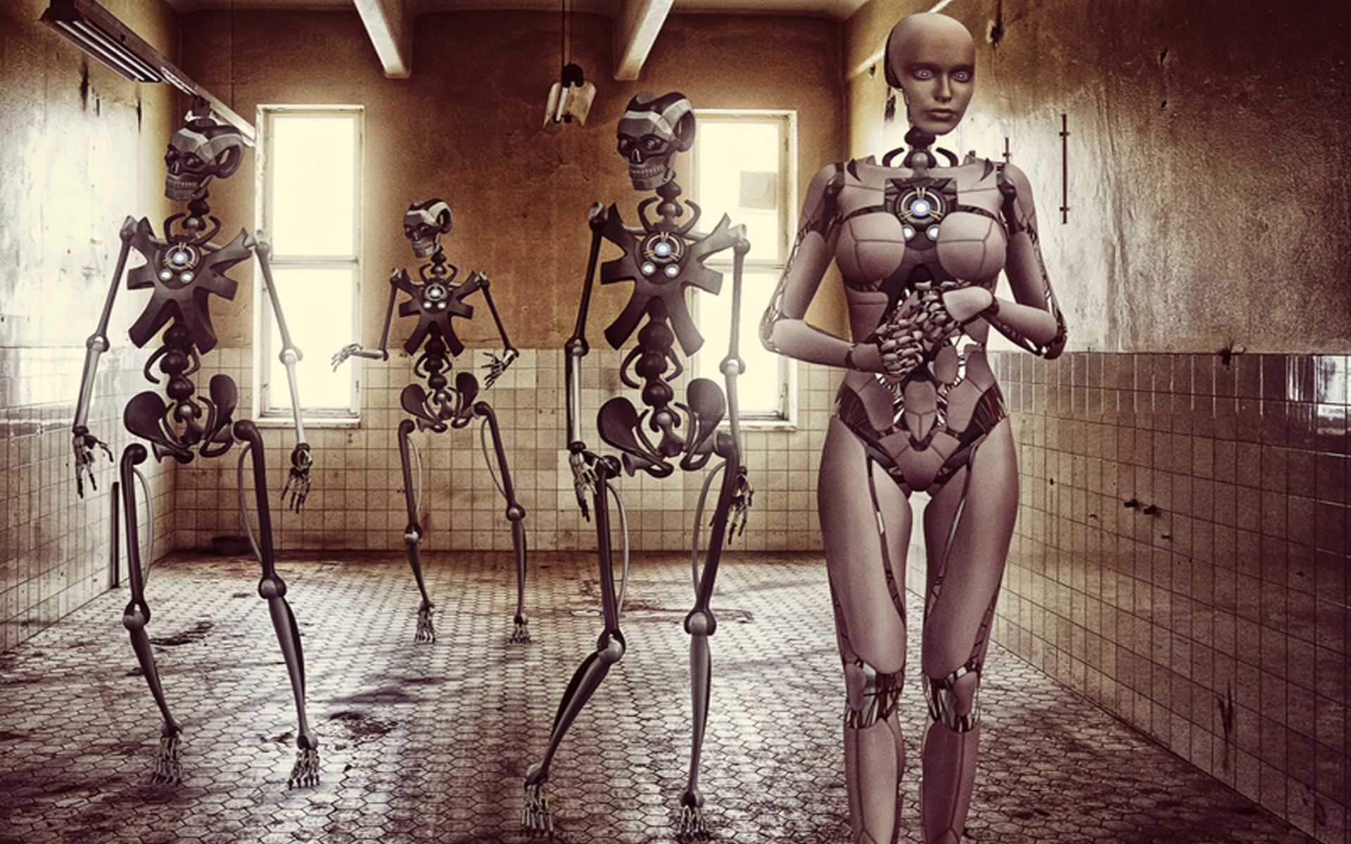 Скачать обои для рабочего стола Скелеты роботов и девушка-бот и фото