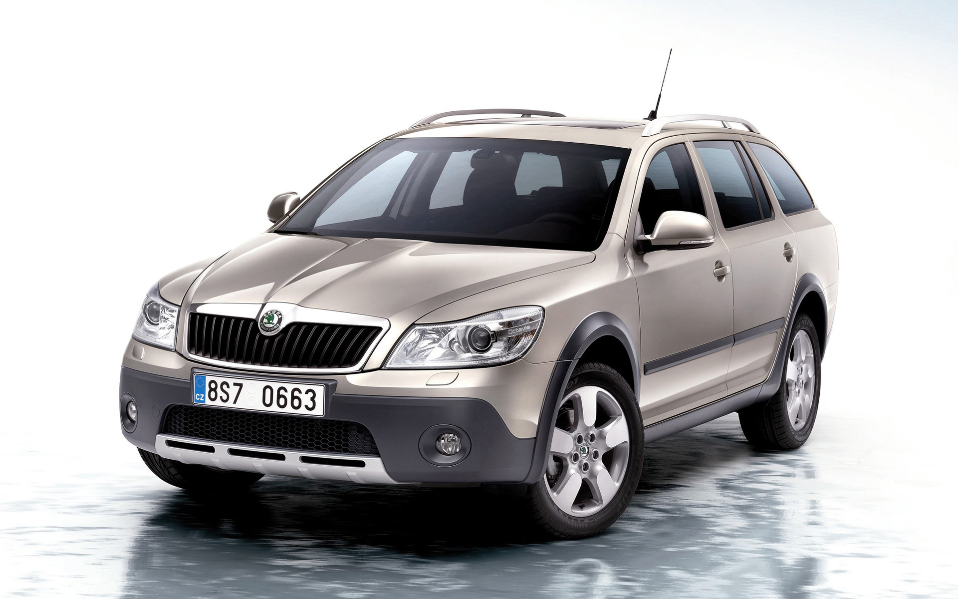 Скачать обои для рабочего стола Skoda Octavia Scout на мокром асфальте и фото