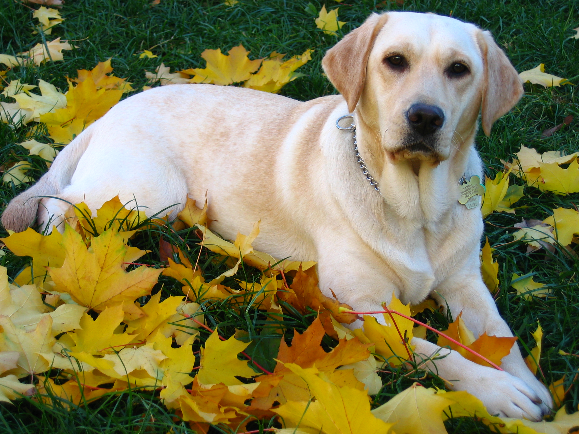 Скачать обои для рабочего стола Собака и осенние листья и фото