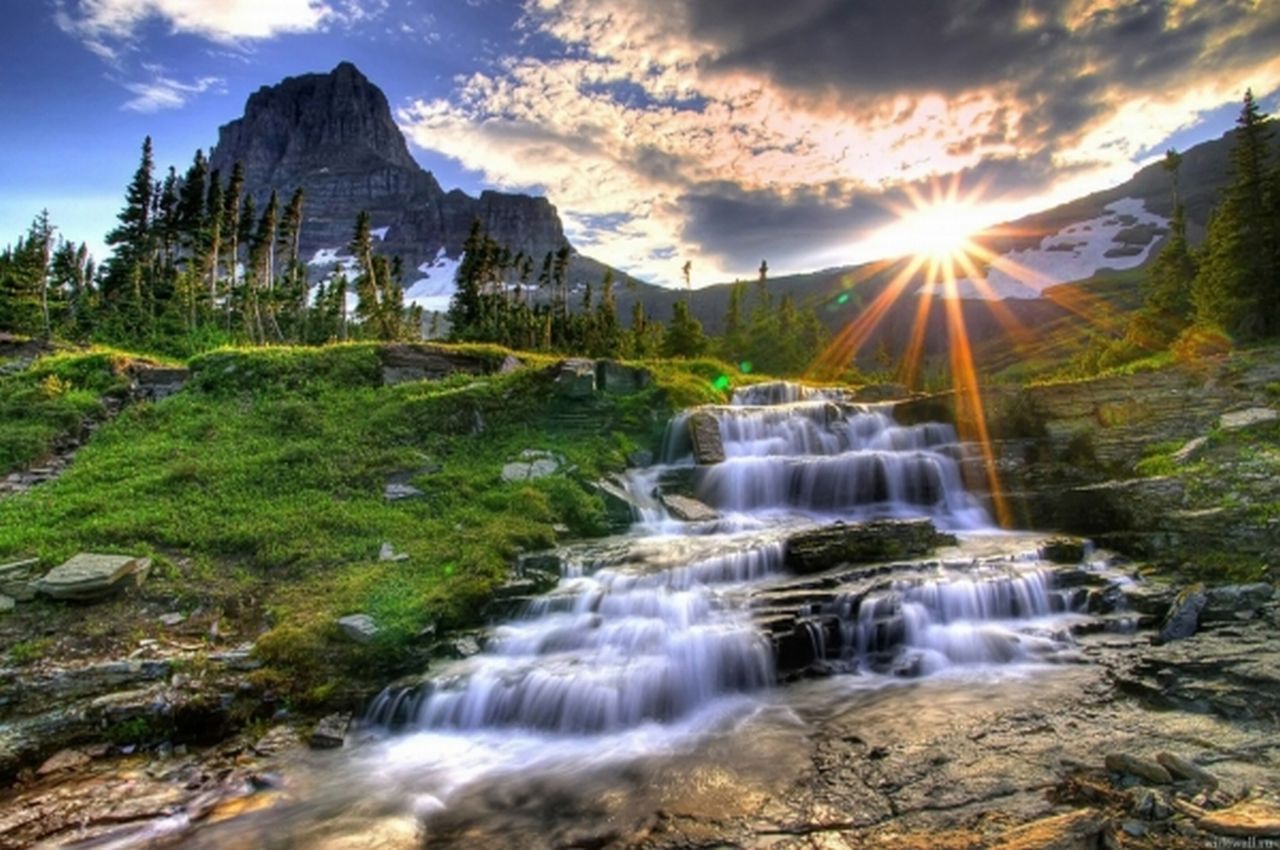 Скачать обои для рабочего стола Солнце, горы, лес и речка и фото