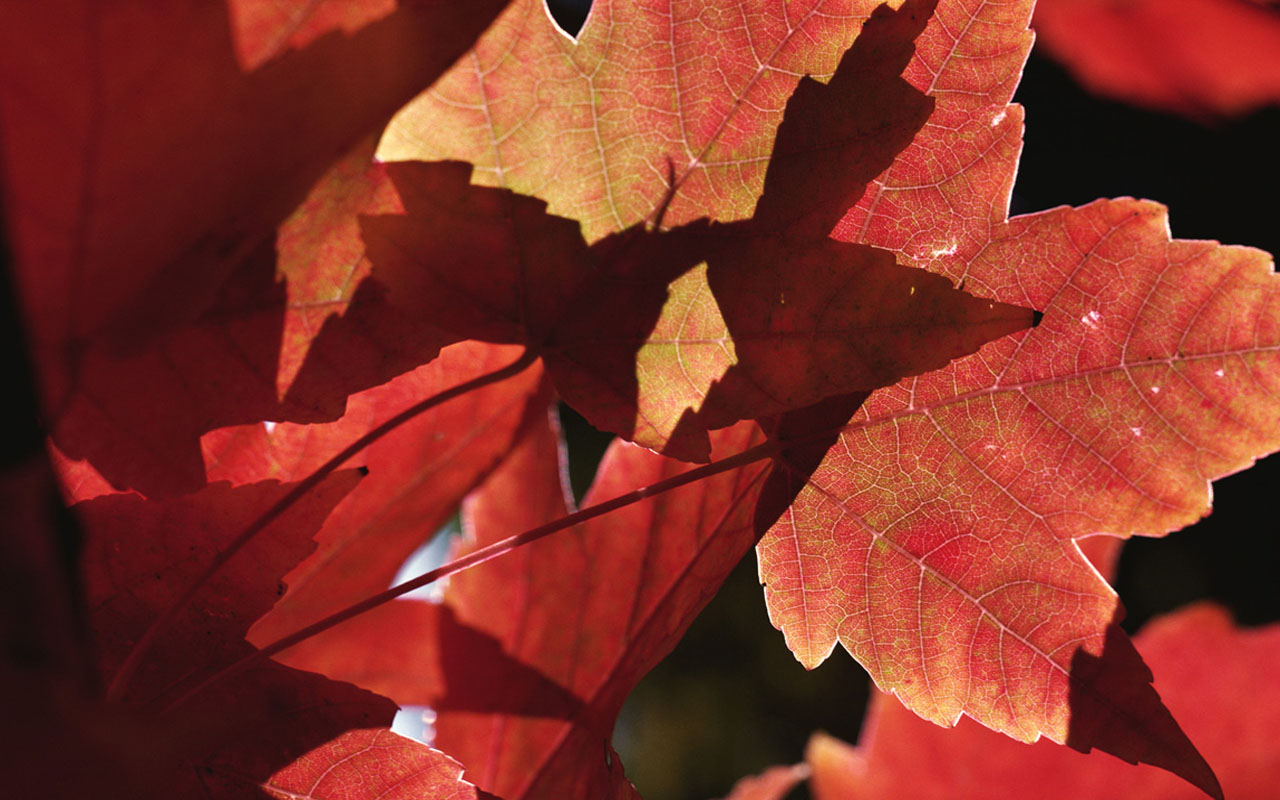 Скачать обои для рабочего стола Солнце на красных листьях и фото