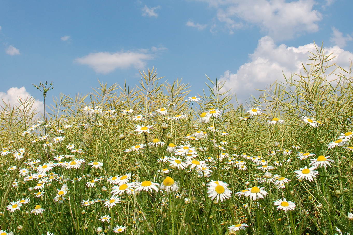 Похожие обои на Солнечный день на летнем поле ромашек: