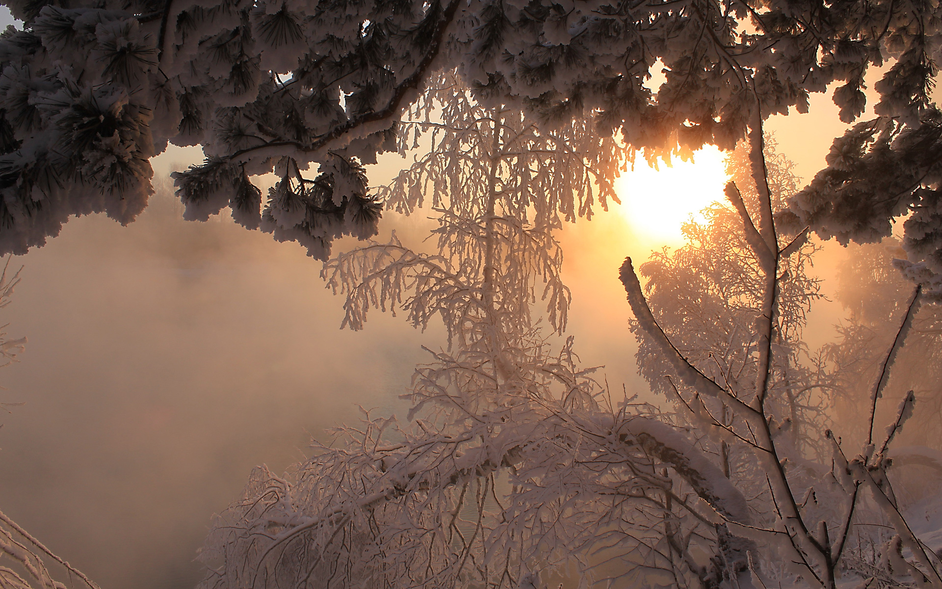 Скачать обои для рабочего стола Сосны и другие деревья в зимней спячке и фото