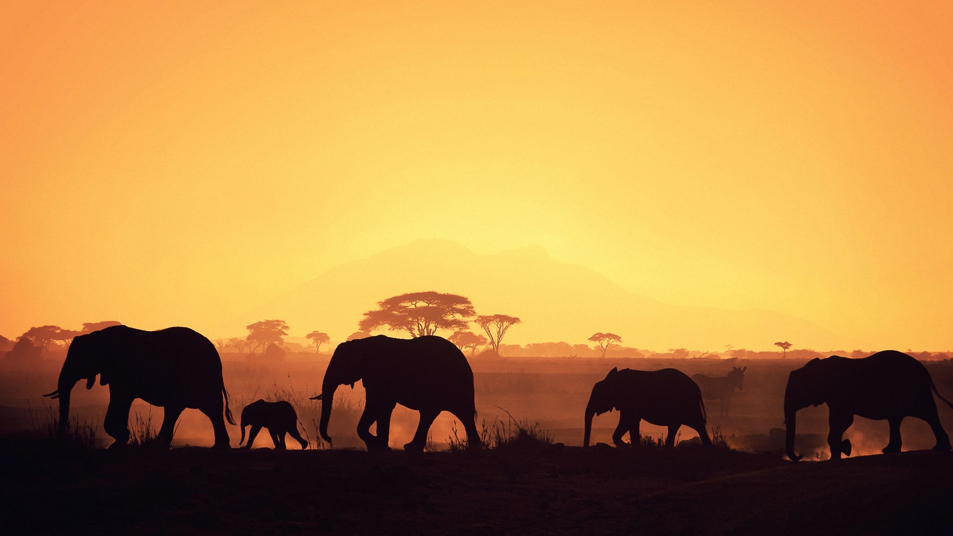 Скачать обои для рабочего стола Стадо слонов на закате и фото