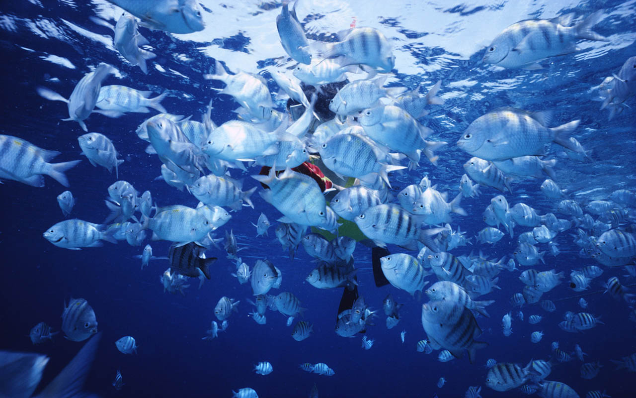 Скачать обои для рабочего стола Стайка рыб и аквалангист и фото